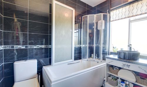 With double glazed window to the rear elevation, bath with shower over, low-level WC, wash hand basin, tiled walls, heated towel rail.