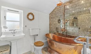 On the first floor is a master bedroom with a beautifully appointed ensuite shower room, two further double bedrooms and a simply stunning family bathroom with a spectacular copper bath.