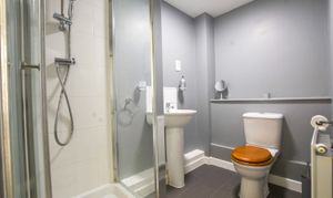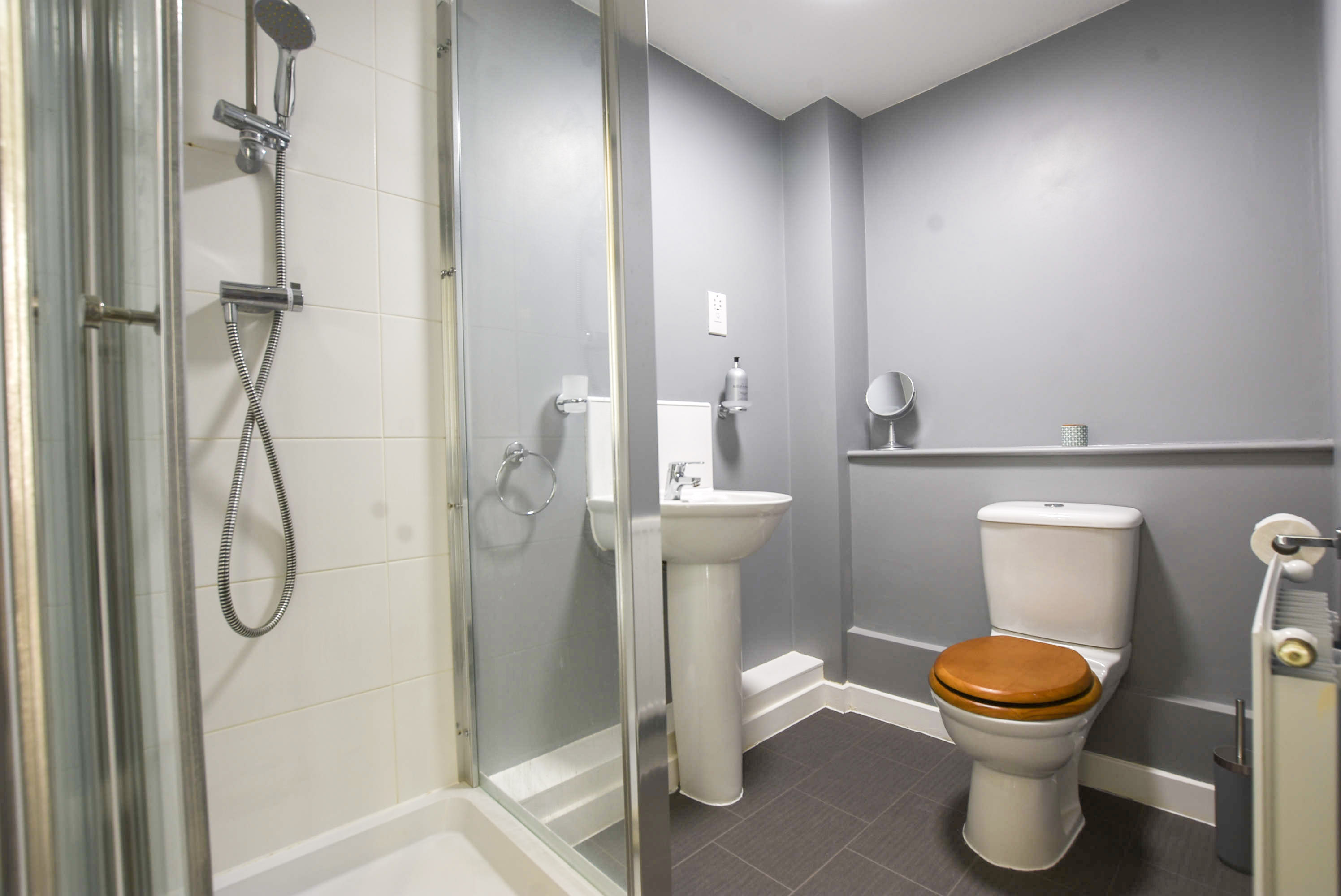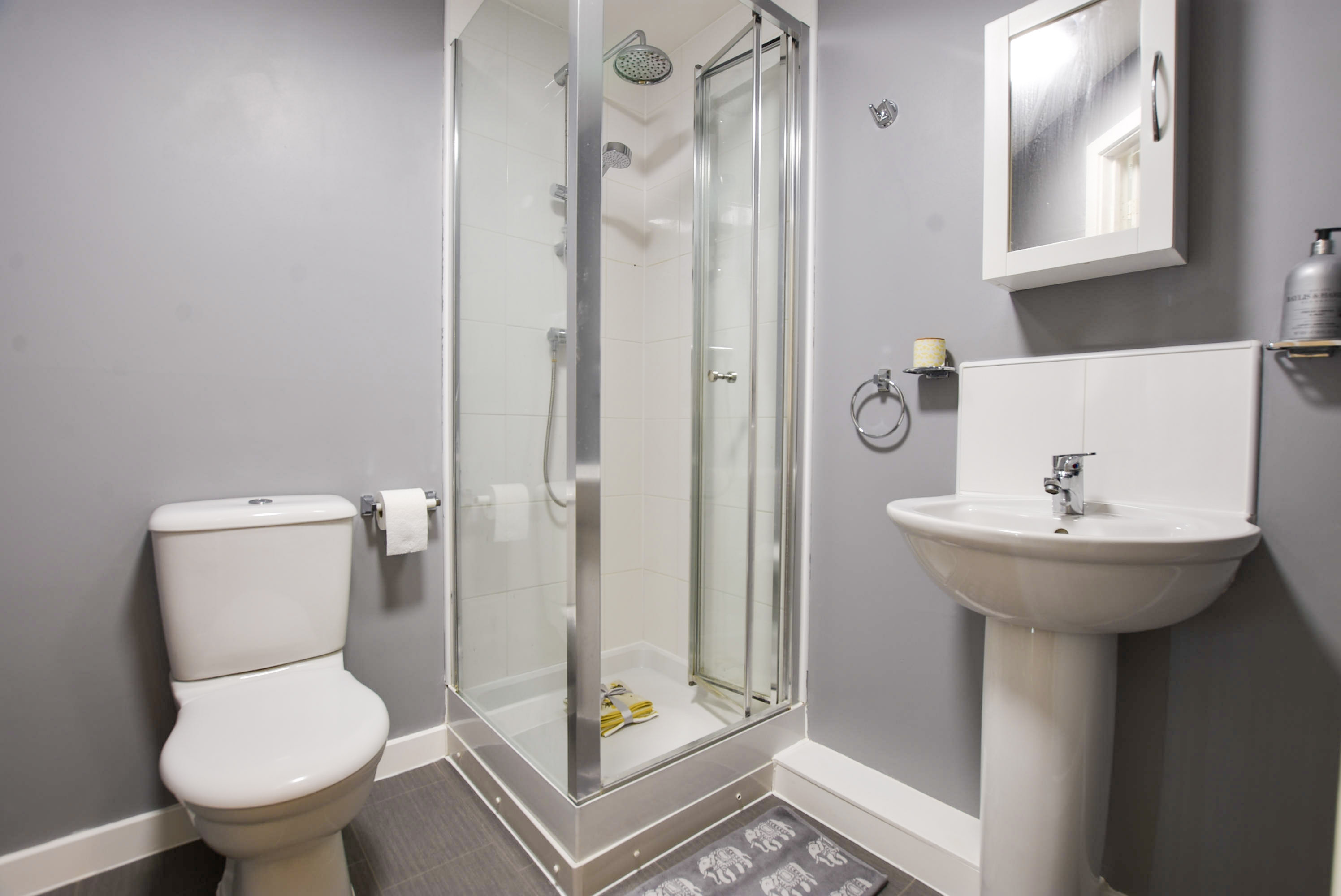 With shower, extractor fan, low-level WC, sink, towel rail, grey laminate flooring, radiator.