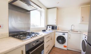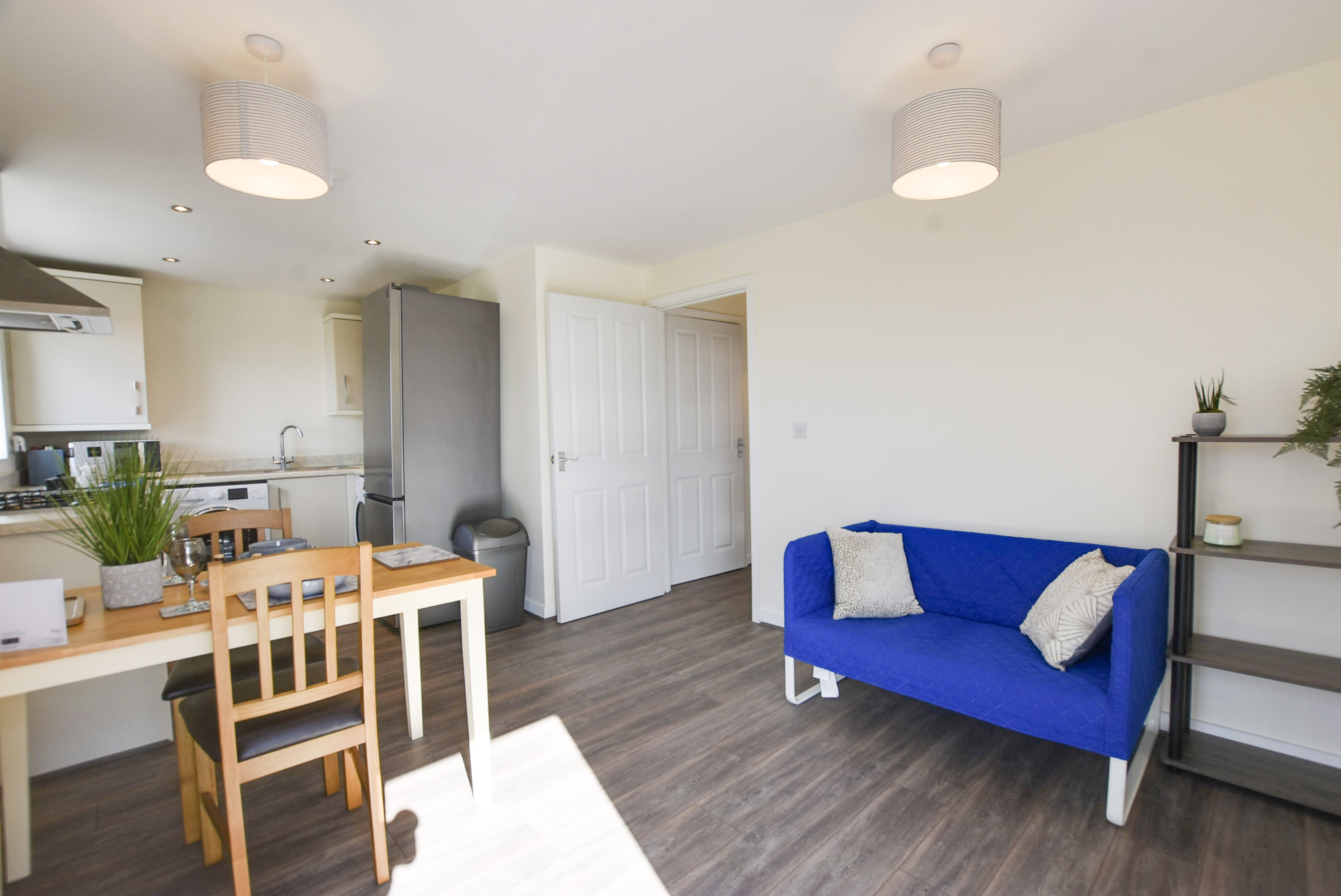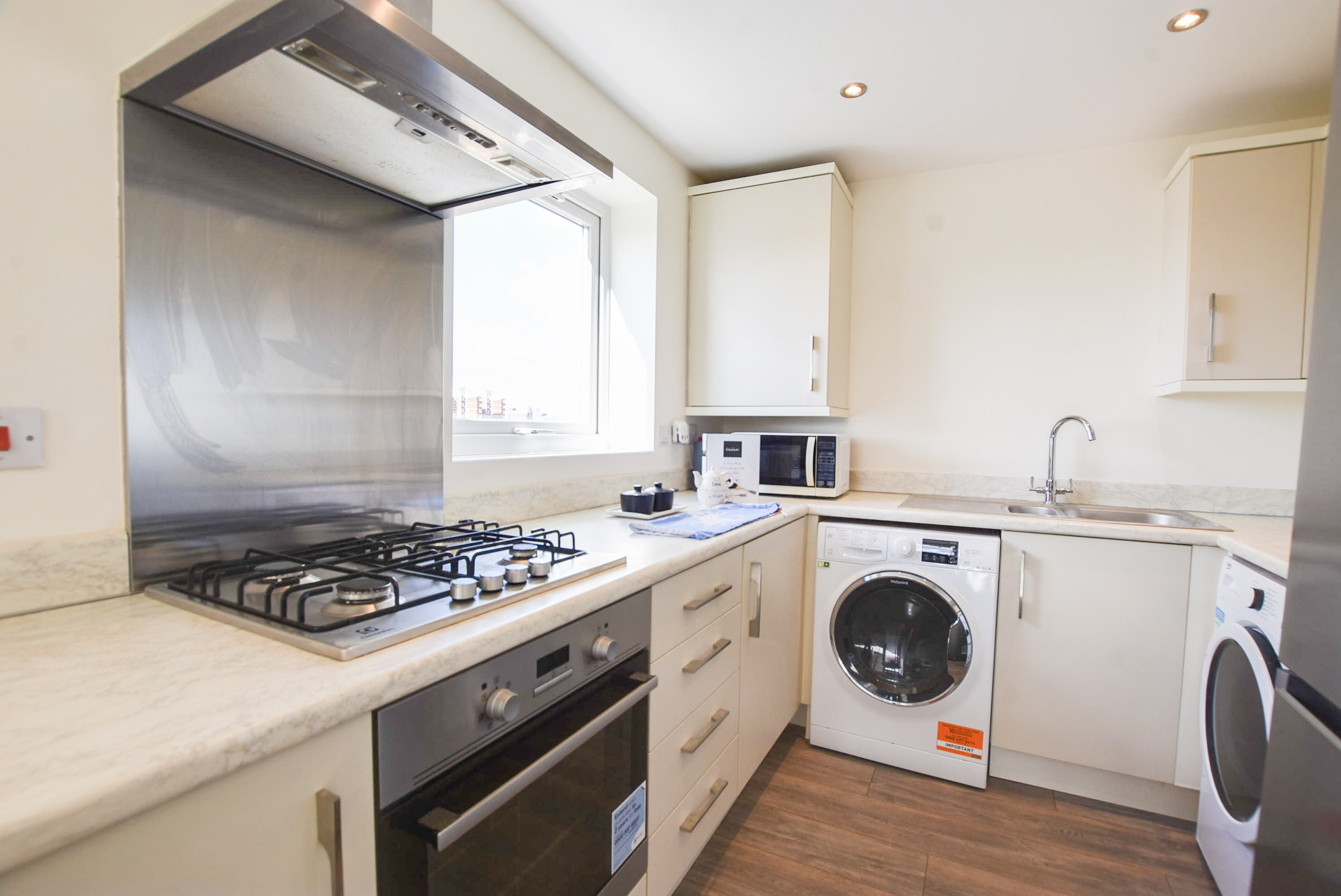 With window and Juliet balcony to the front elevation, window to the side elevation, one-and-a-half-bowl sink and drainer, integrated gas hob and oven with extractor, freestanding washing machine and dryer (will remain), fridge freezer (will remain), grey laminate flooring, radiator. Also remaining are a bookcase, dining table, two chairs, blue sofa and two mobile storage units.