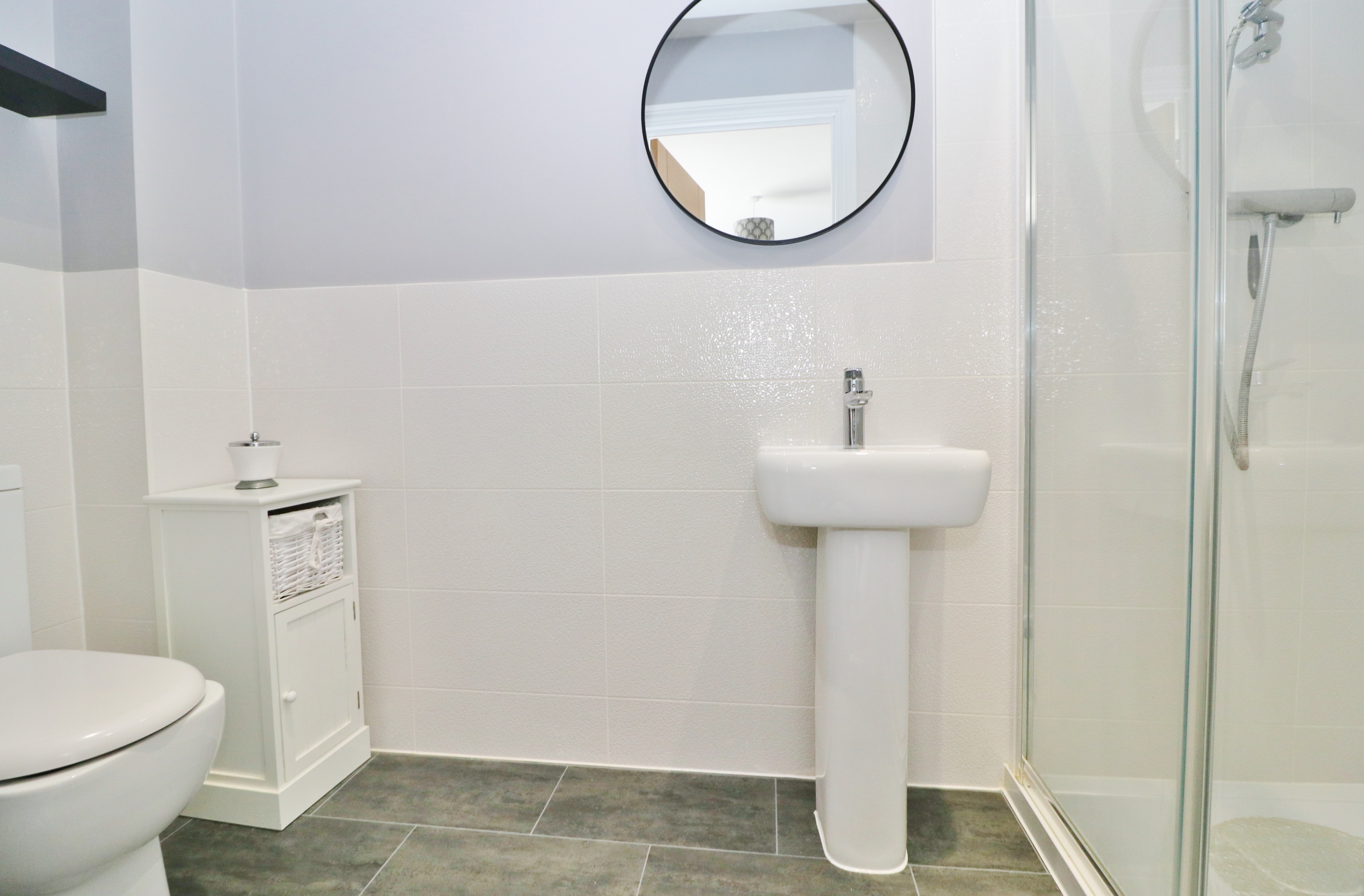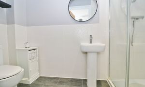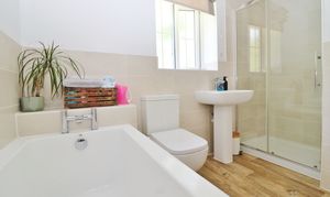 The modern family bathroom has been fitted with a panel enclosed bath, separate shower cubicle, wash hand basin and a window to the rear.