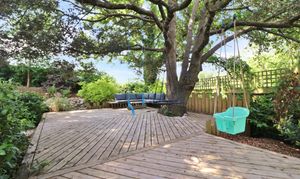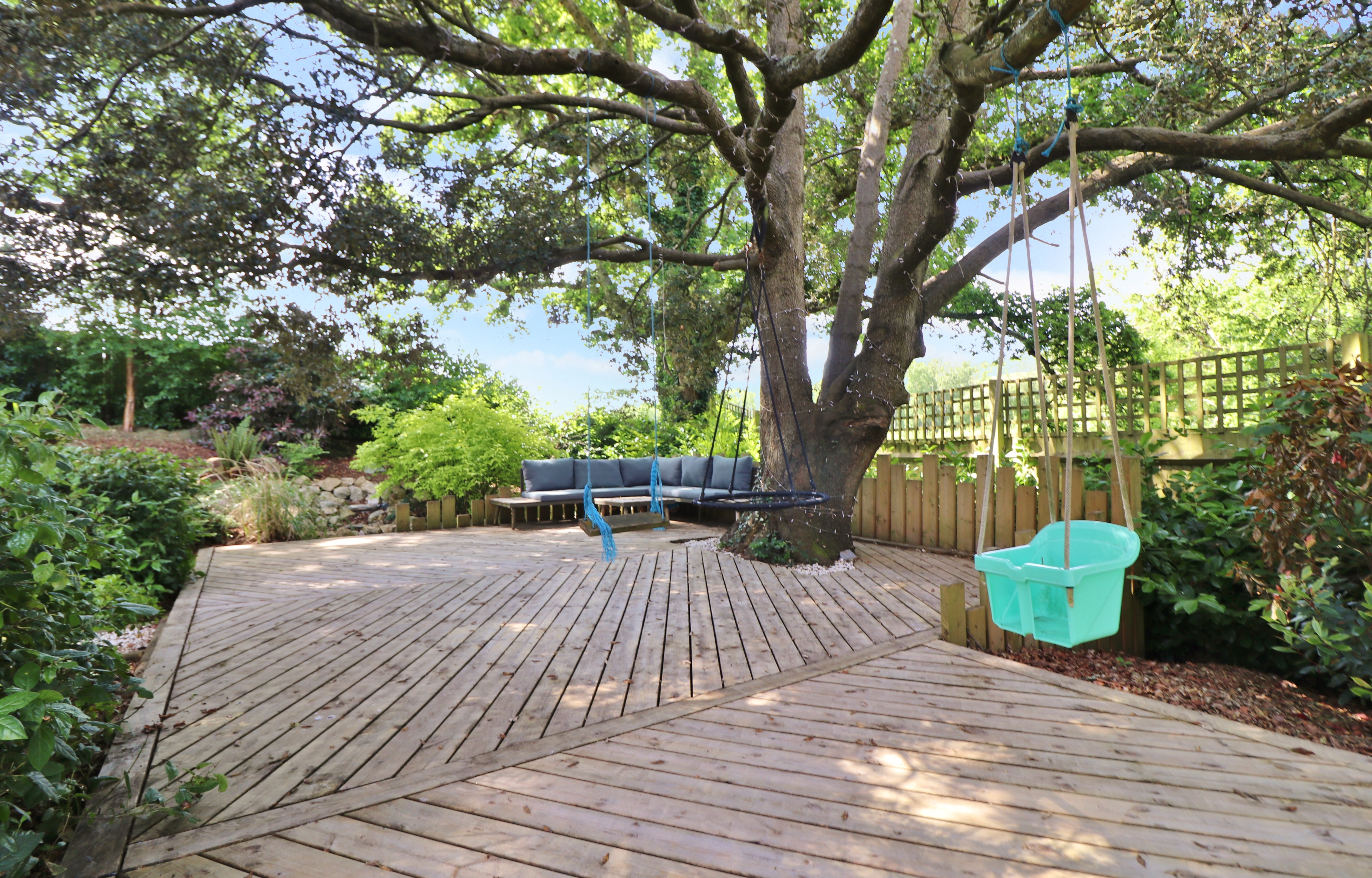 To one corner there is a summer house, whilst to the adjacent corner there is a decked seating area fitted around an oak tree.
