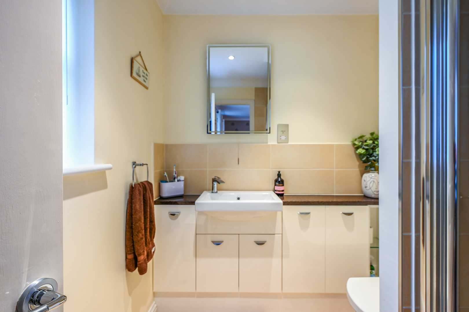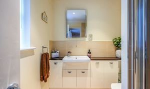 Window to the front, square shower enclosure with thermostatic digital shower and tiled walls, WC, wash basin with vanity and storage below, extractor, towel radiator and vinyl flooring.
