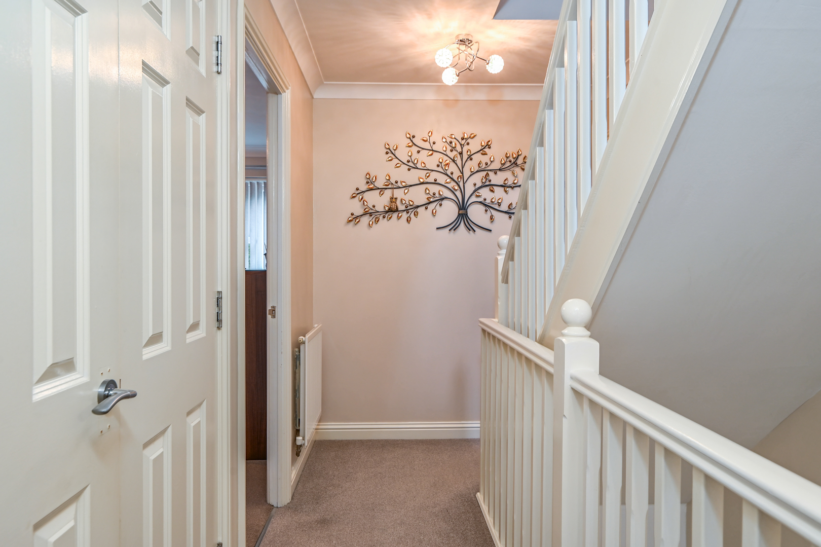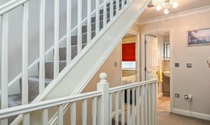 Doors to each room, stairs leading to the second floor, large airing cupboard housing hot water cylinder, radiator and fitted carpet to the stairs and landing.
