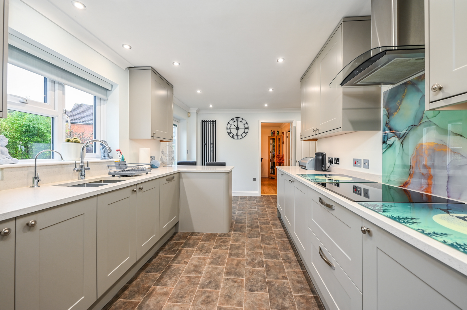 Window to the rear and doors leading out to the garden, door to utility room, radiator and vinyl flooring. Kitchen comprising a modern design with matching wall and base units with Quartz work-surfaces, under-slung sink, built-in appliances including an eye-level oven, microwave, 4-zone induction hob, extractor hood, dishwasher and full-height fridge.