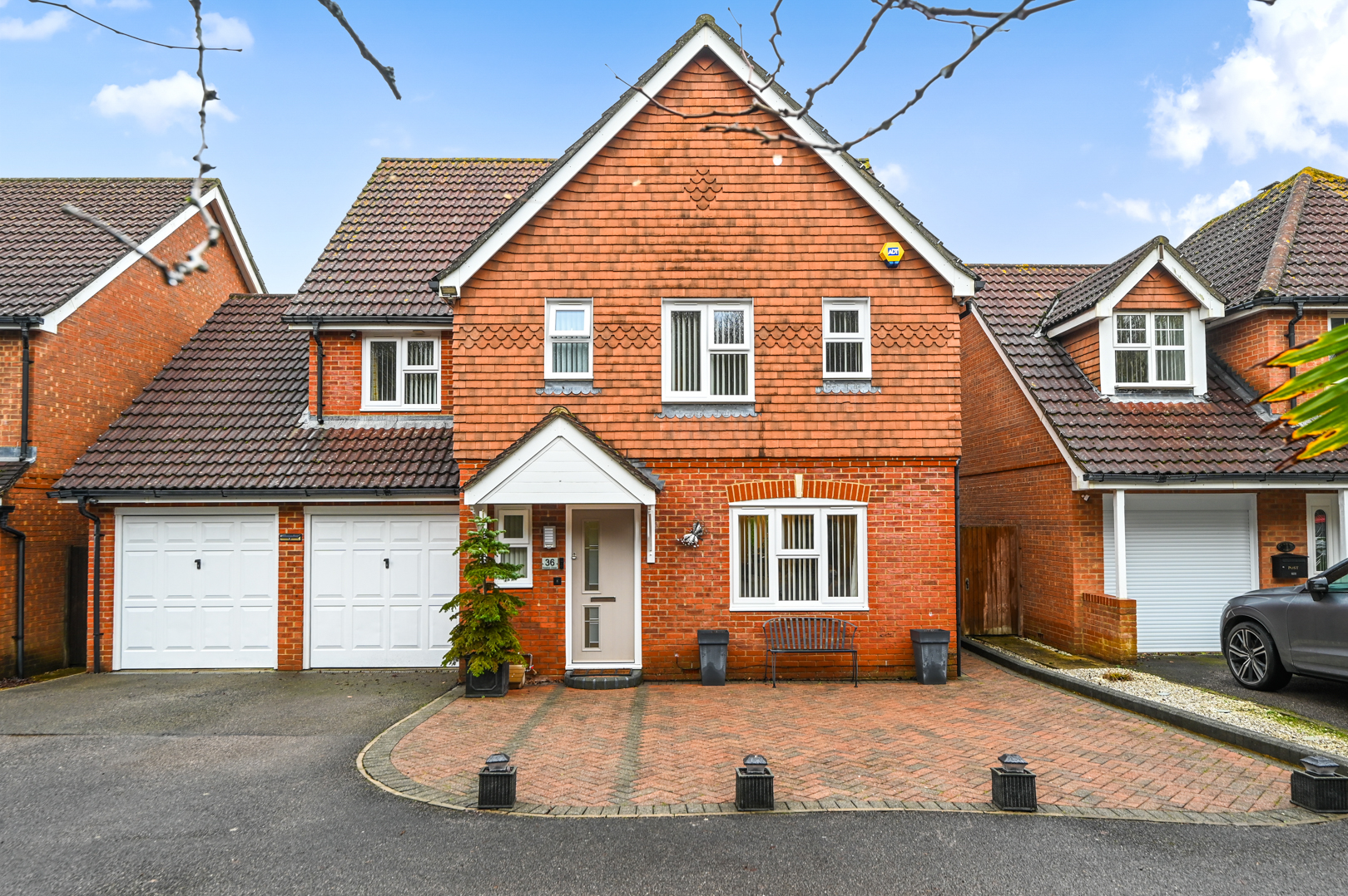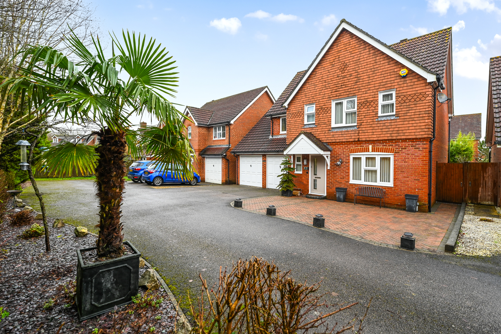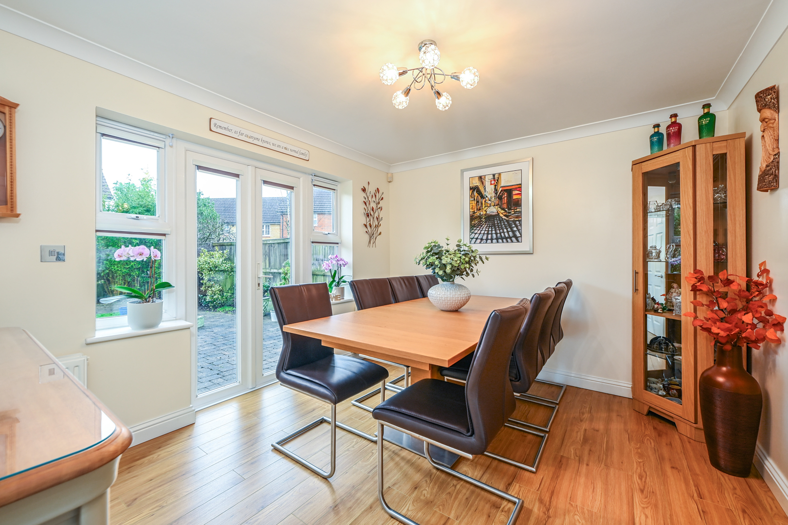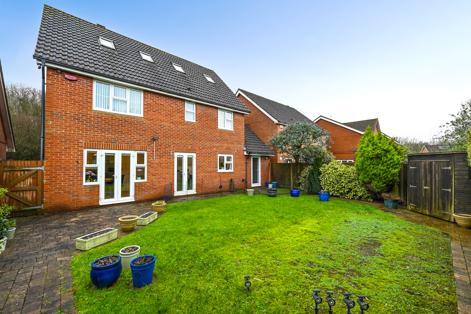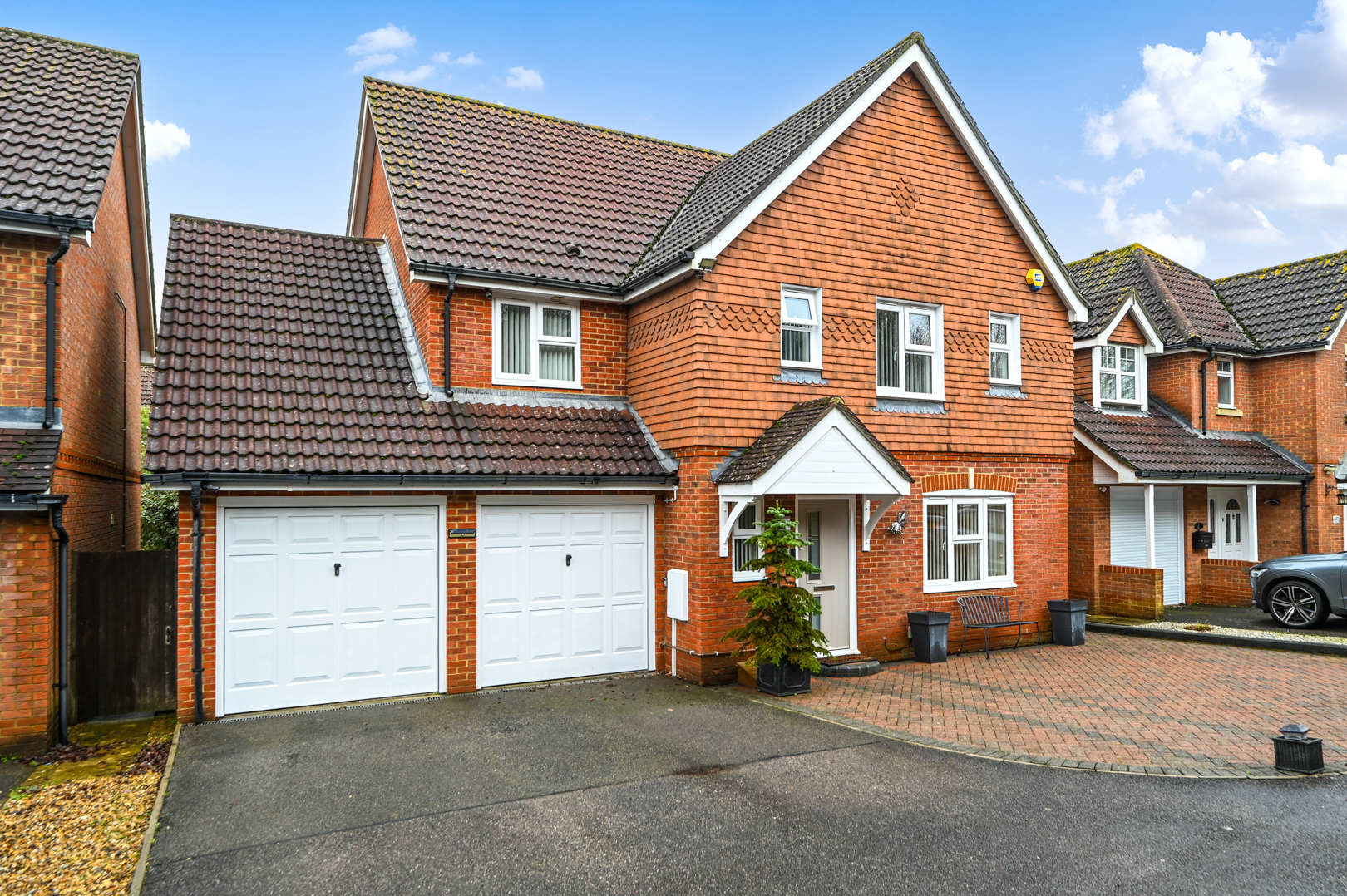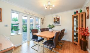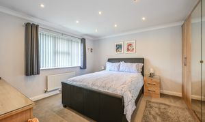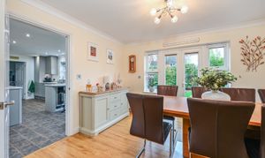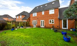Outside, the rear garden is generously sized and thoughtfully landscaped with mature planting, creating a private and secure environment for children to play, summer entertaining or relaxed family time. To the front, the property truly stands out with extensive off-road parking for up to five vehicles, a rare and highly sought-after feature within Park Farm, complemented by a double garage. The home enjoys a peaceful, tucked-away position, shared with only a small number of neighbouring properties and overlooking a tree-lined pathway and wooded area, enhancing the sense of privacy and connection to nature.