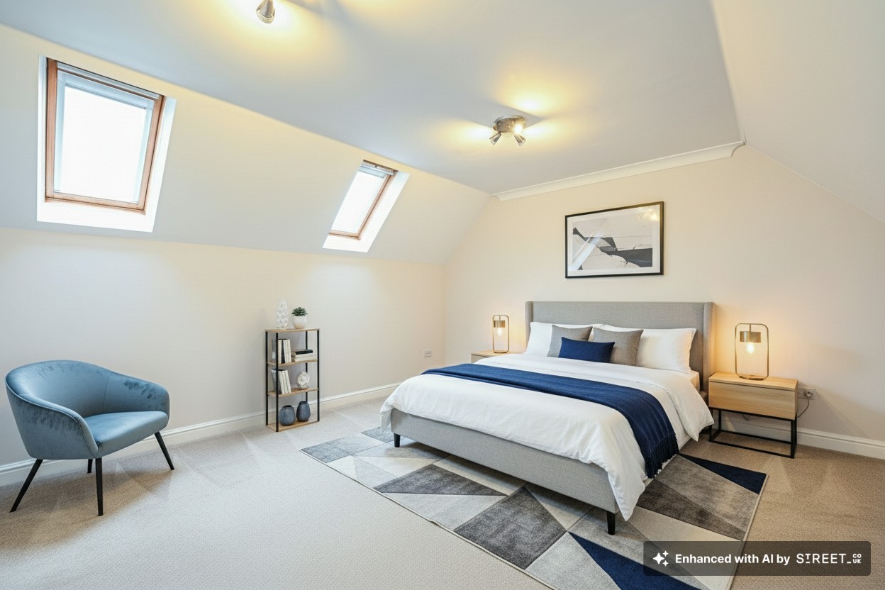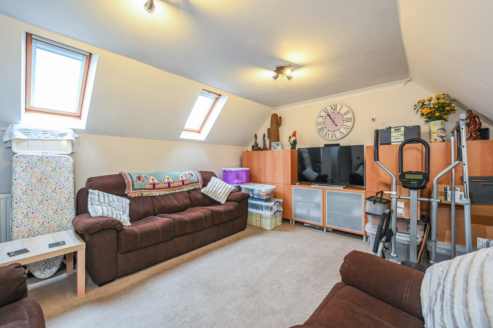 Roof windows to the rear, eaves access, radiator and fitted carpet.