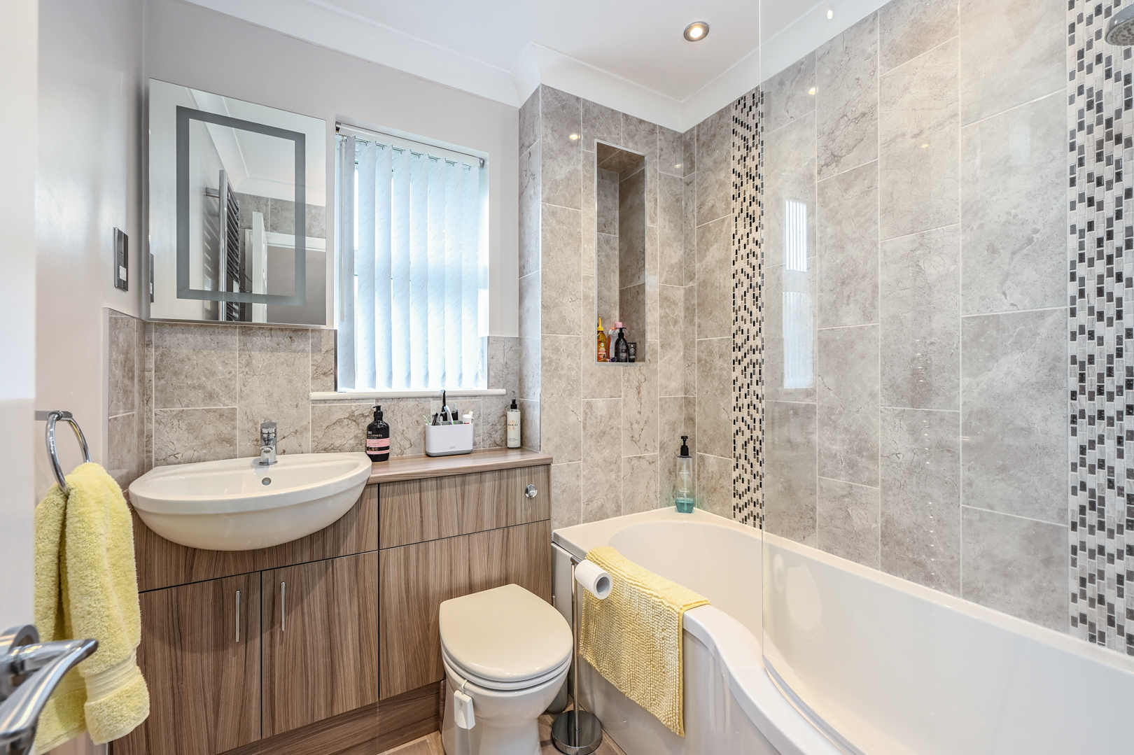 Window to the rear, ‘P’ shaped bath with mixer taps, thermostatic digital Aqualisia shower and glass shower screen, WC, wash basin with storage below, extractor, towel radiator, part wall tiling and vinyl flooring.