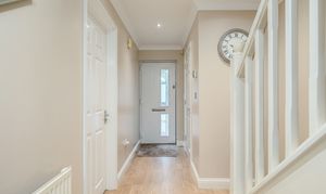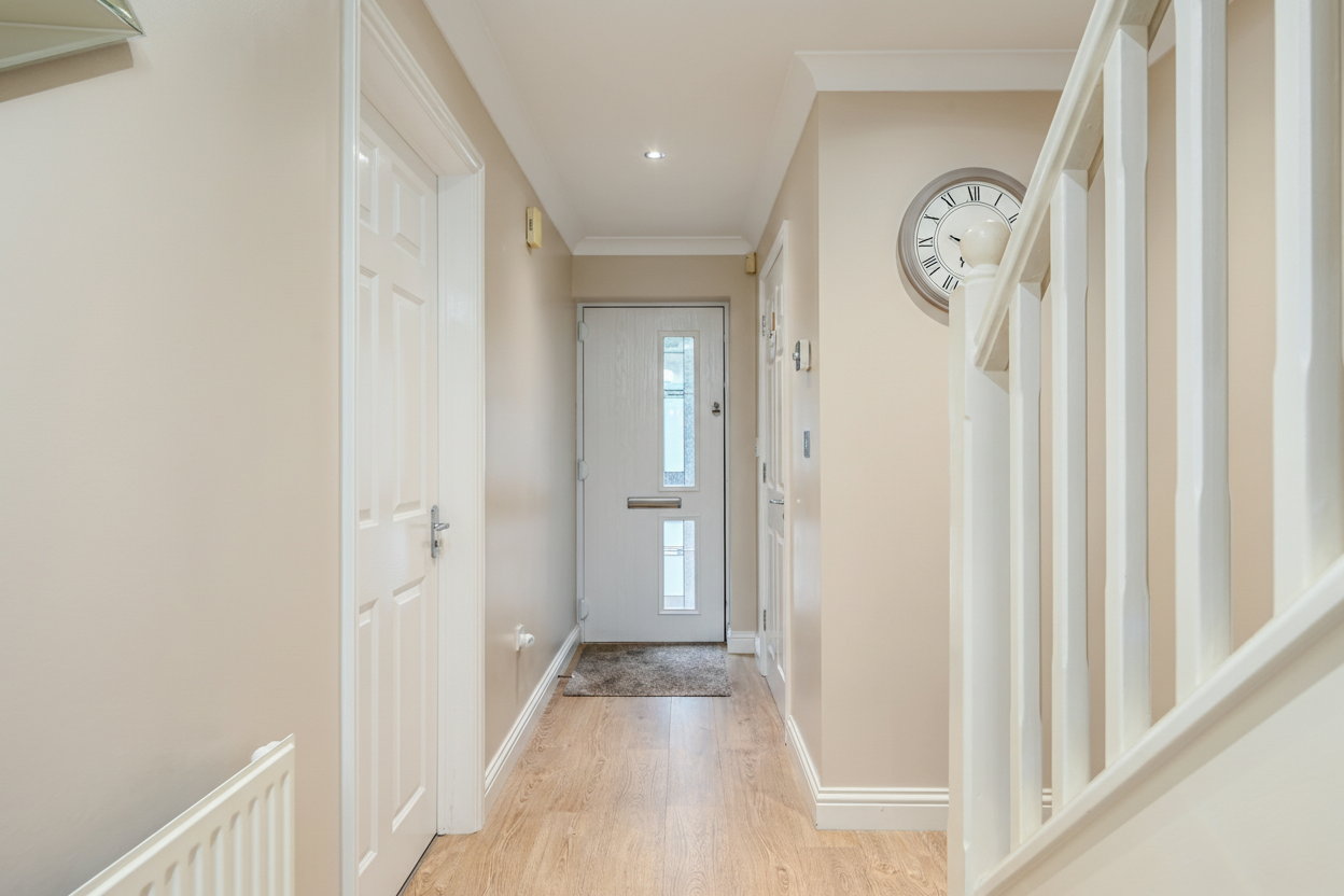 Part glazed composite door to the front, stairs leading to the first-floor with under-stairs storage cupboard, doors to each room, radiator, alarm panel and laminate wood flooring.