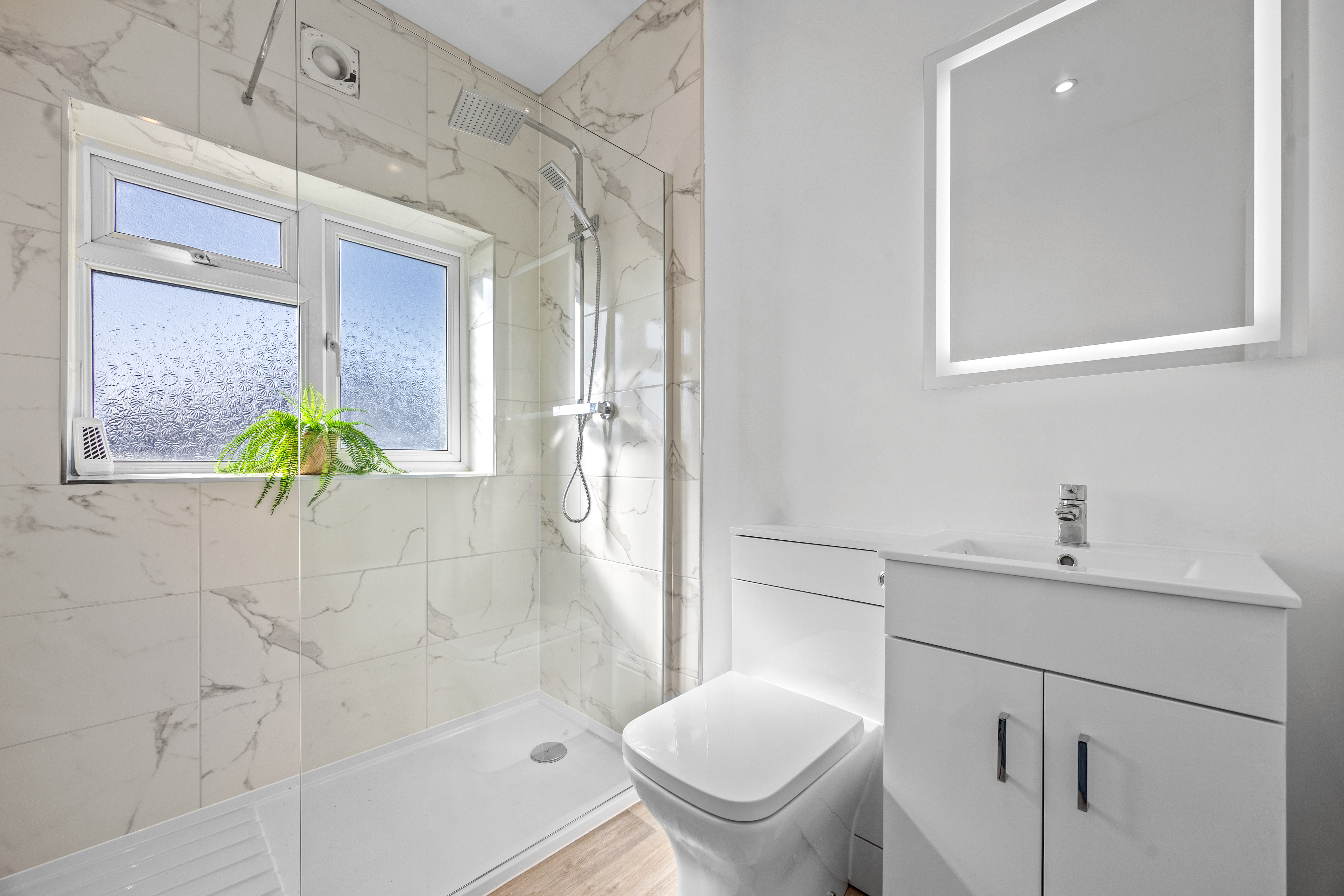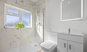 Upstairs, the landing is spacious and well lit. All three bedrooms are of a size suitable for double beds. The family shower room is newly fitted and includes a three-piece suite with a shower, basin, and vanity unit.