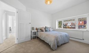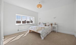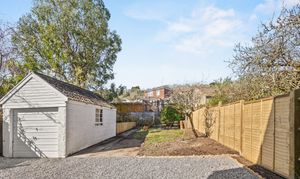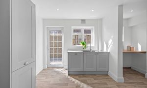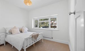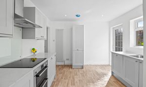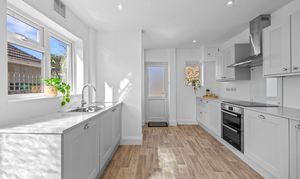 The front reception room benefits from large bay windows and offers space for a couple of sofas, making it suitable as a comfortable lounge. The rear reception room is well suited as a dining room, with a pleasant outlook over the garden and large sliding patio doors. The kitchen is a generous galley-style space at the rear of the property, fitted with newly installed shaker-style wall and base units. It includes an integrated double oven, electric hob, and stainless steel extractor hood. There is also a designated area for use as a utility space, with room for appliances and additional worktops. The kitchen is large enough to accommodate a small table and chairs for everyday use.