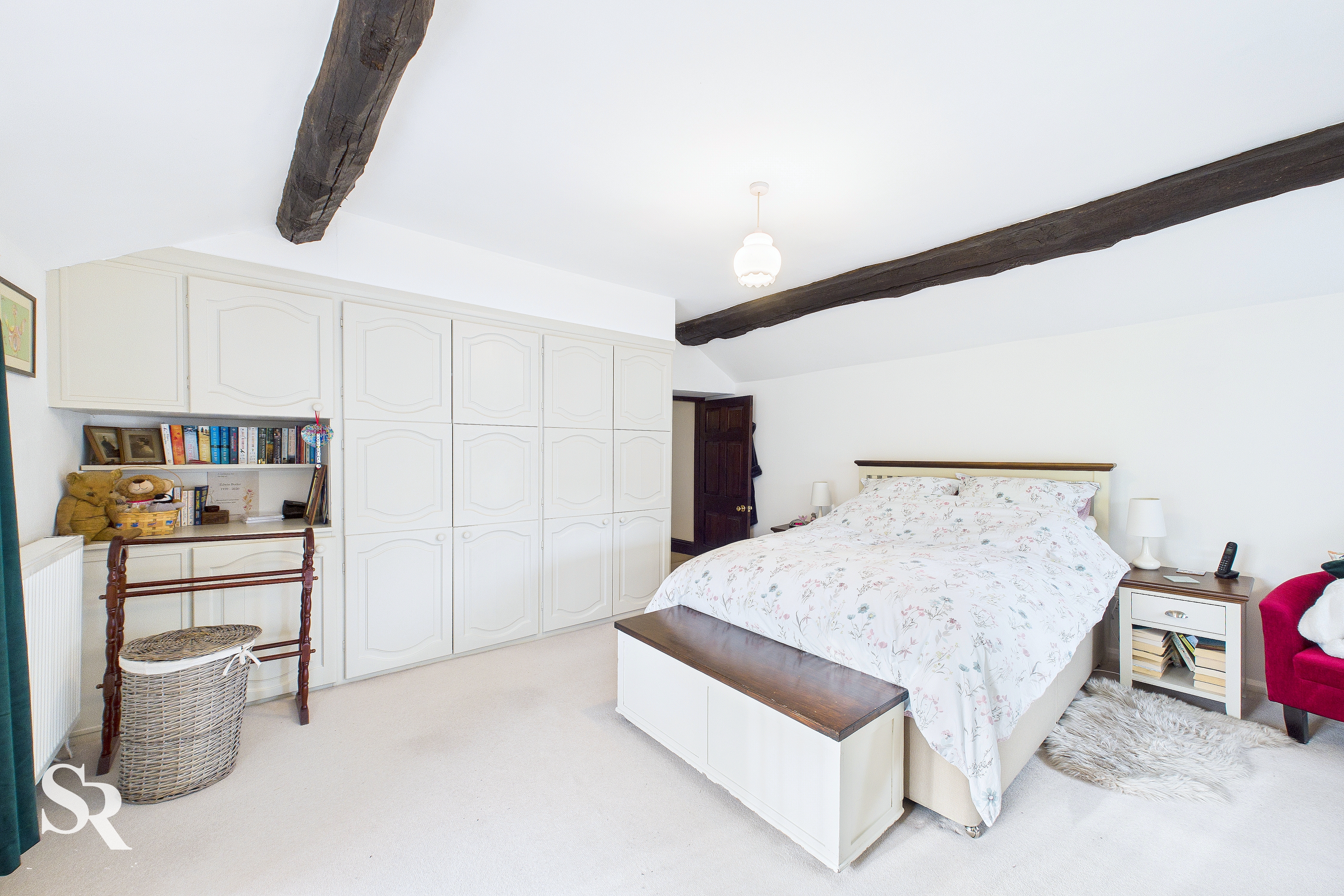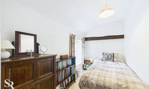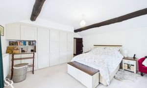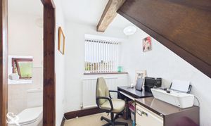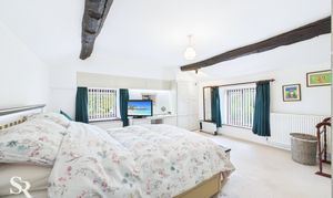Boasts carpeted flooring and rear-aspect timber-framed windows framing stunning countryside views. The original character is beautifully maintained with exposed timber beams complemented by the timber staircase railing. Practicality is addressed with a useful built-in cupboard housing the boiler and providing extra storage.