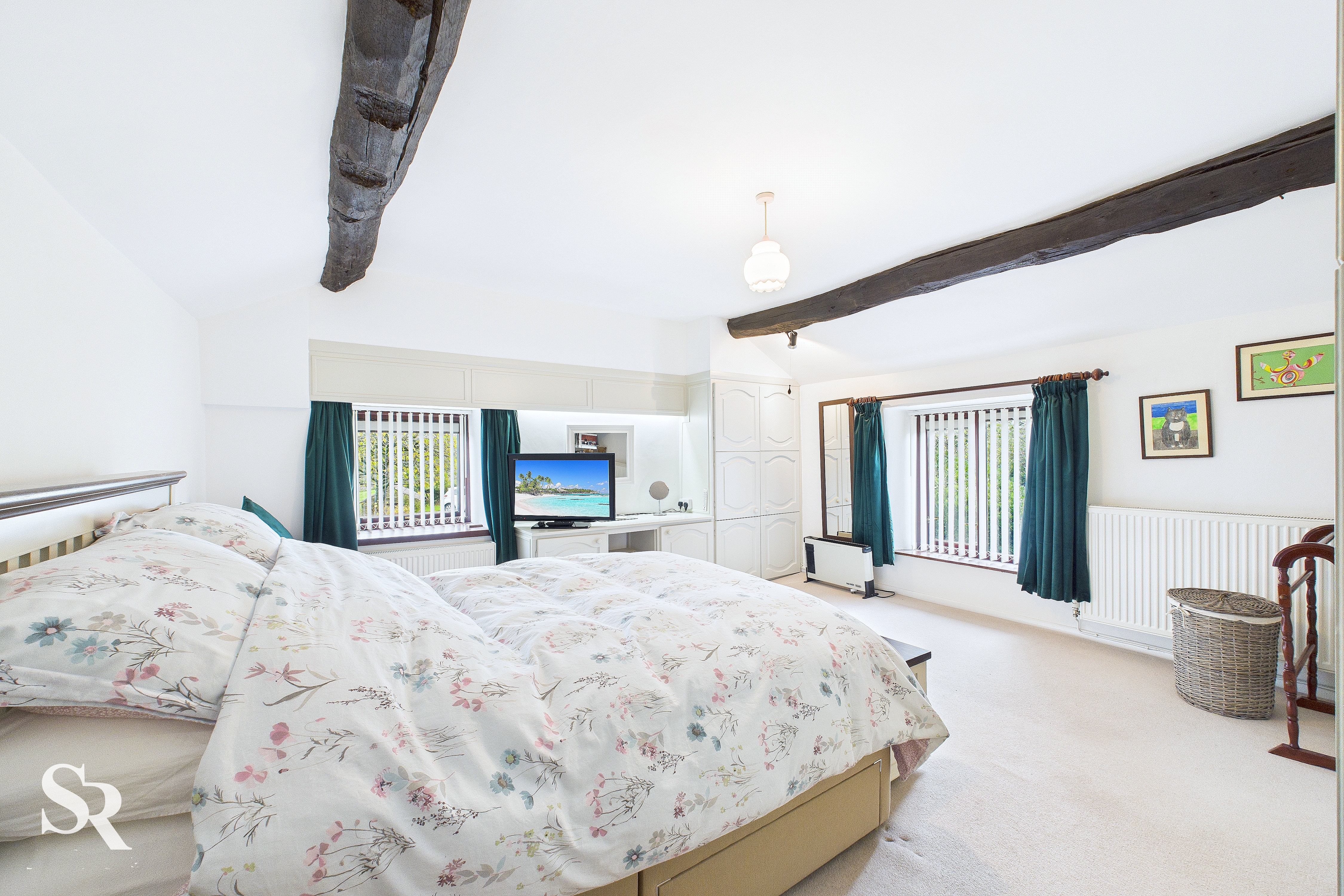 The generously proportioned main bedroom features carpeted flooring and dual-aspect timber-framed windows fitted with vertical blinds, allowing you to soak in the surrounding countryside views. The space boasts striking vaulted ceilings, original timber beams, and ample storage provided by built-in wardrobes.