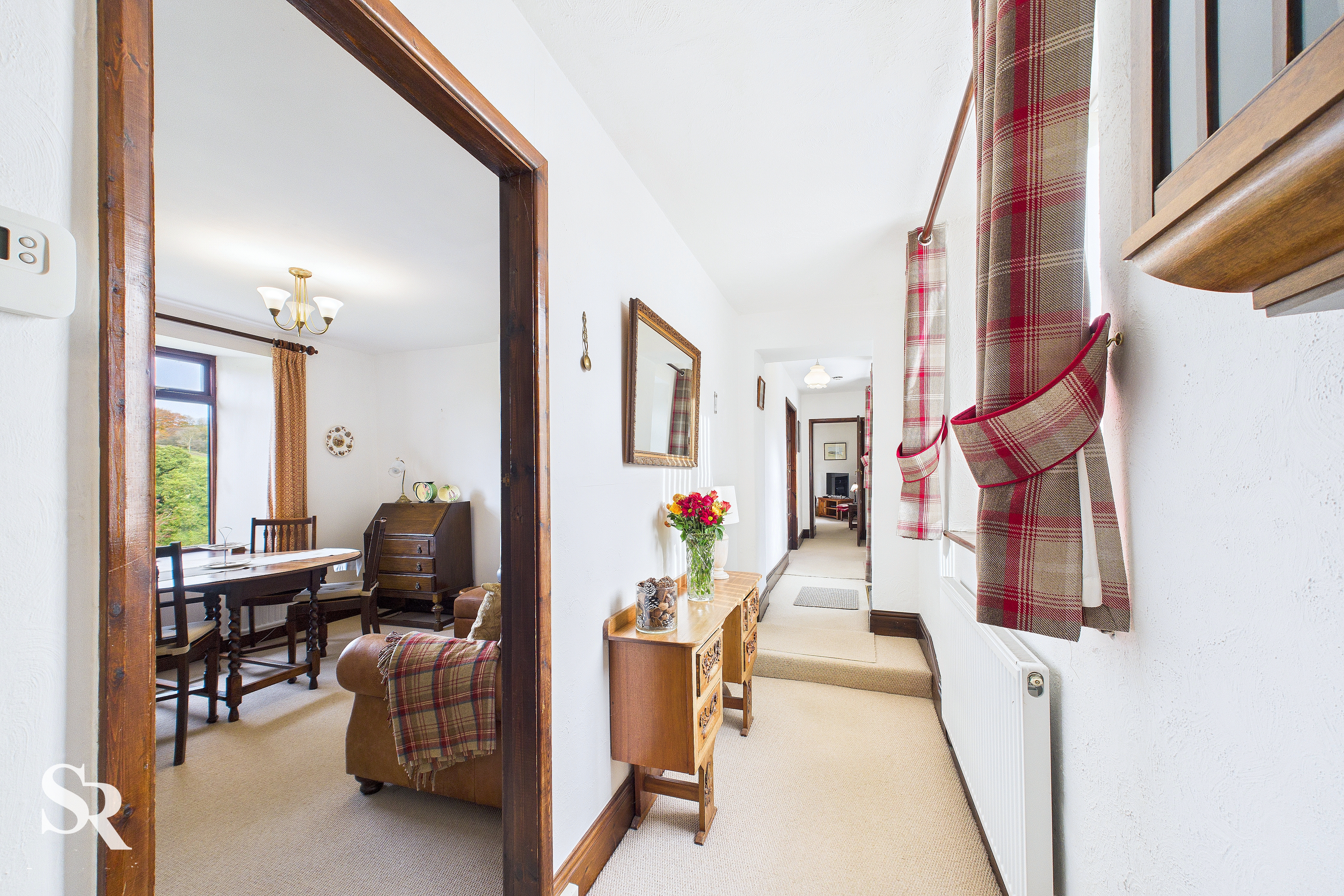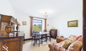 The dedicated dining room or snug offers a cosy setting for meals, featuring carpeted flooring and a rear-aspect timber-framed window that captures a magnificent countryside view.