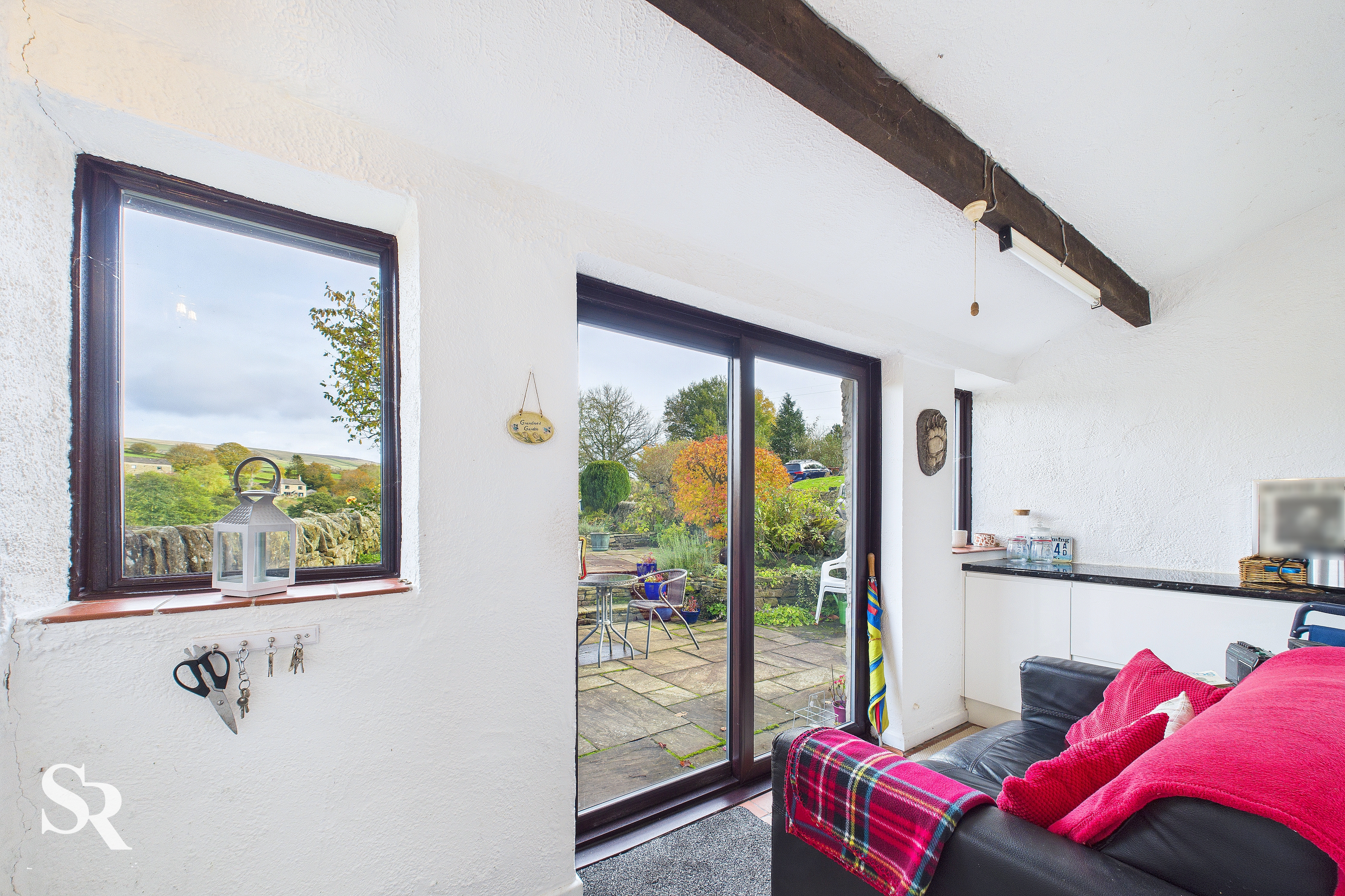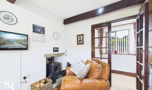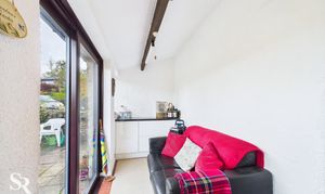 Accessed via the living room with tiled flooring and a timber-framed window. The uPVC glass slider provides access to the garden and features a vaulted ceiling and an exposed timber beam, with fitted cupboards offering convenient storage.
