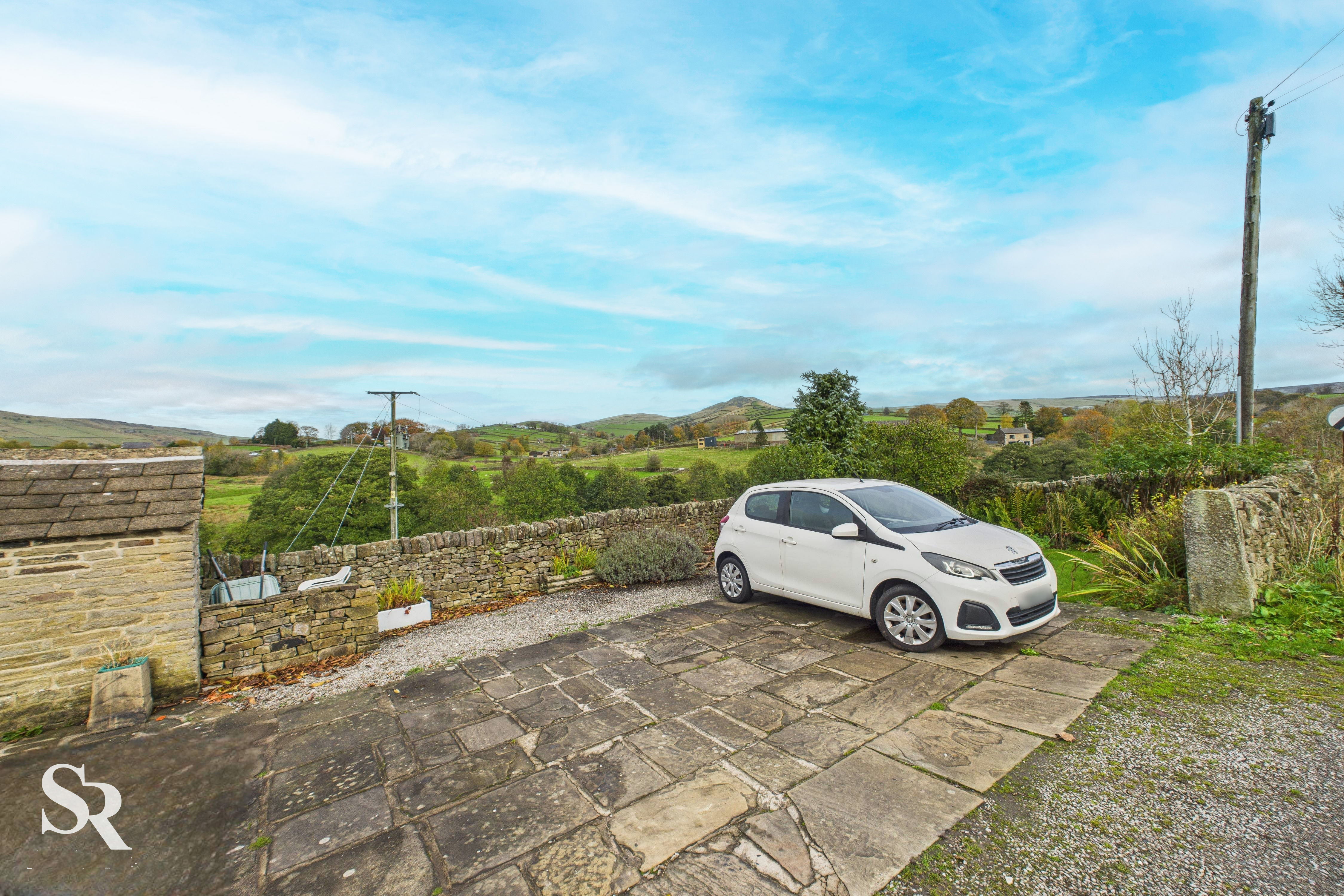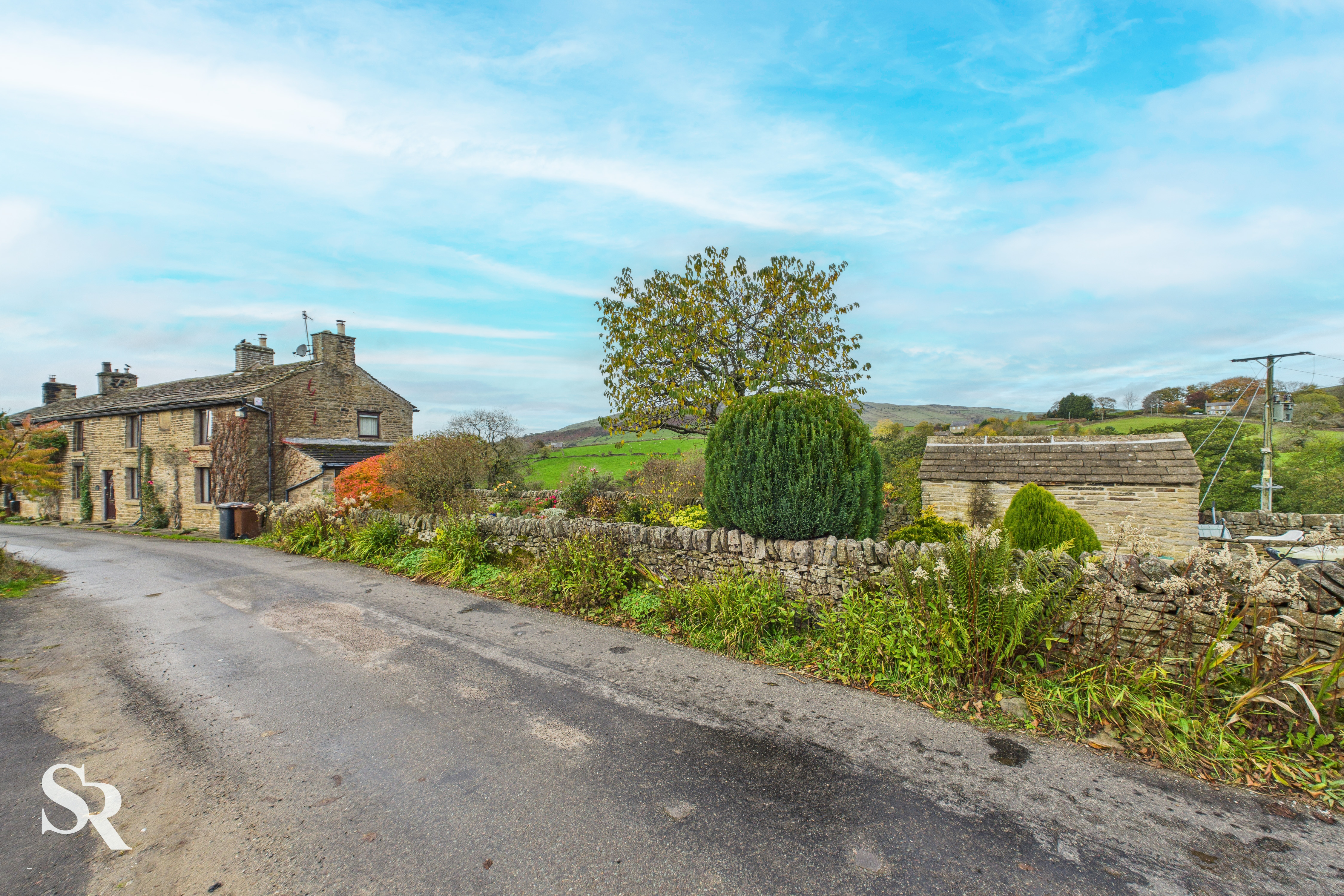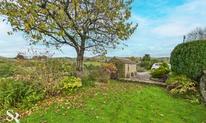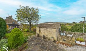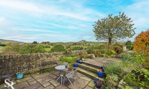 This stunning side-aspect garden perfectly extends the home’s beautiful stone facade. Positioned to maximise the setting, it enjoys unspoilt panoramic countryside views. Traditional drystone walling defines the boundaries, lending authentic character to the landscape. The stone-paved drive offers valuable off-road parking, while a charming stone-built garden shed provides practical storage. Terraced patios create ideal spots for outdoor dining, framed by that spectacular view.