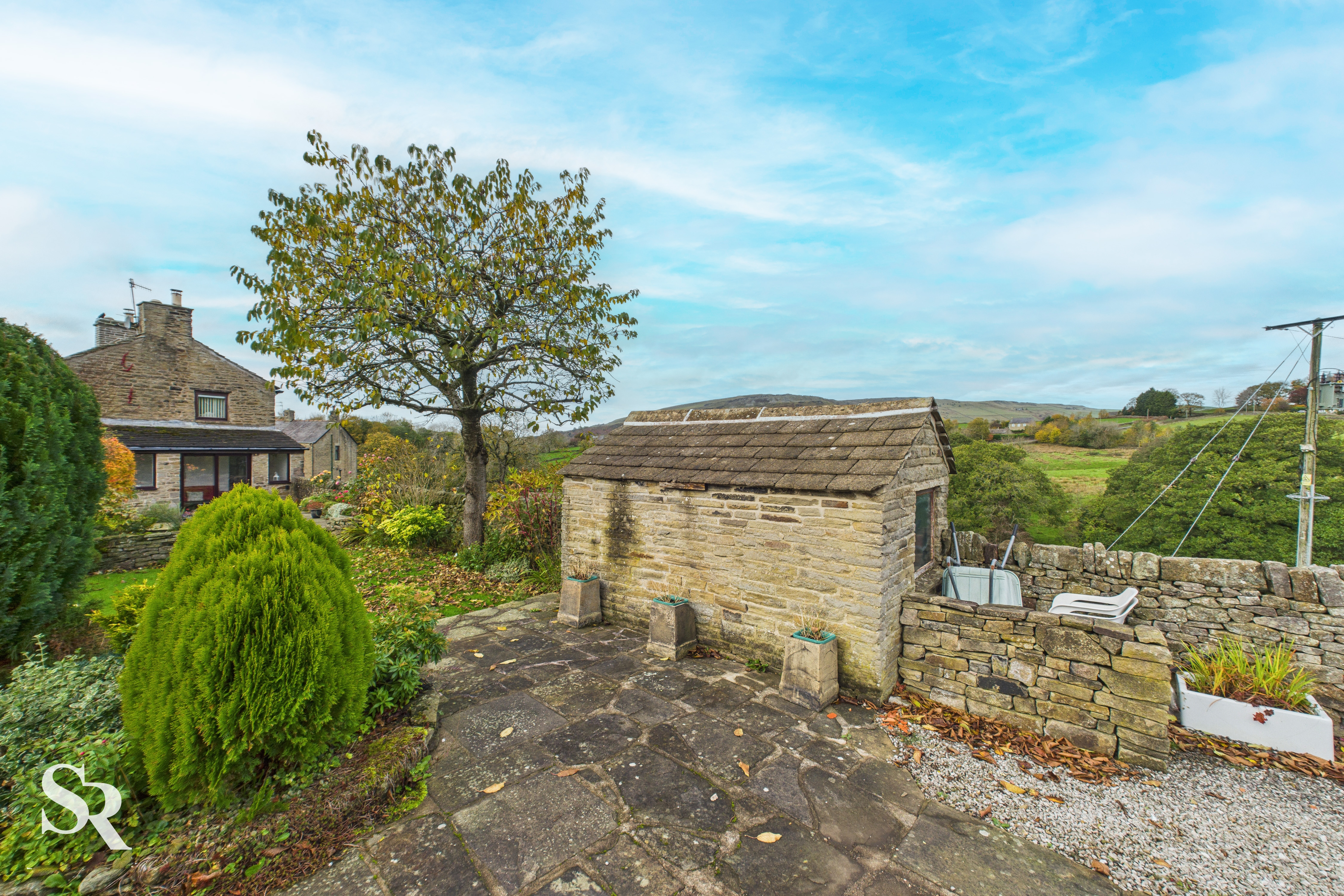 Outside, a private garden perfectly complements the home’s charm, framed by traditional drystone walling and offering breathtaking views across open countryside. The stone-paved driveway provides off-road parking for several vehicles, while a delightful stone-built garden shed adds extra storage. The terraced patios make the most of the panoramic outlook — perfect for relaxing or dining outdoors.