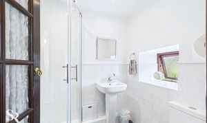The shower room is finished with tiled flooring and half-height tiled walls. It houses a tiled corner shower with bevelled shower glass doors. A rear timber-framed window with privacy glass and a heated towel rail completes this functional space.