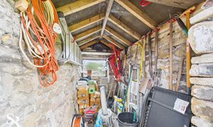 Located conveniently on the driveway, the stone-built garden shed offers external storage. The sturdy structure features concrete flooring and is illuminated by a timber frame window, making it ideal for storing tools, bikes, or garden equipment.
