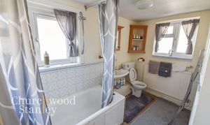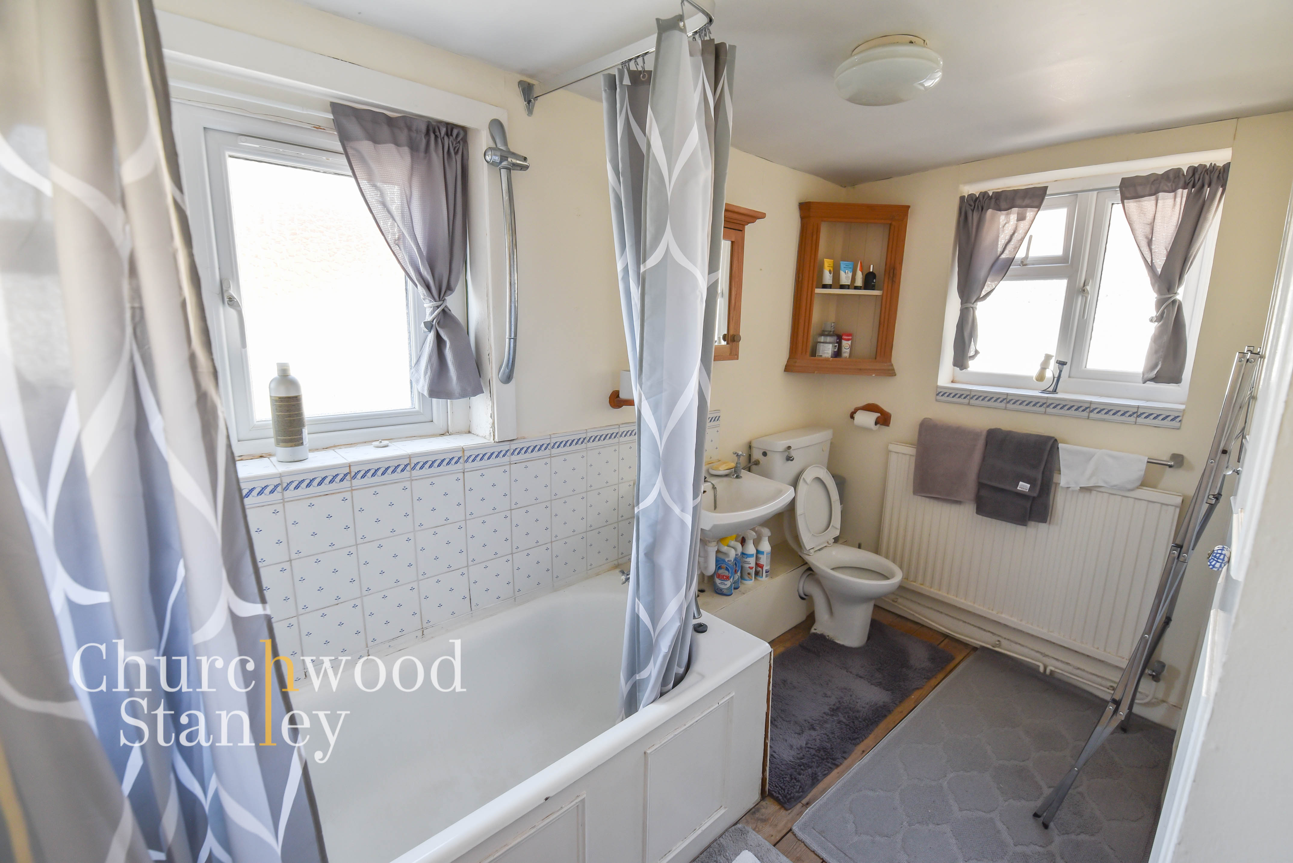 The first-floor bathroom is bright and well-proportioned, with dual windows allowing natural light to fill the space. It’s fitted with a traditional suite, including a bath with overhead shower, WC, and pedestal wash basin, complemented by tiled splashbacks and a wall-mounted cabinet for storage. The room feels practical and functional, with plenty of scope for updating to suit modern tastes, while its size offers flexibility for reconfiguration if desired.