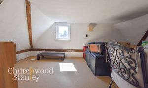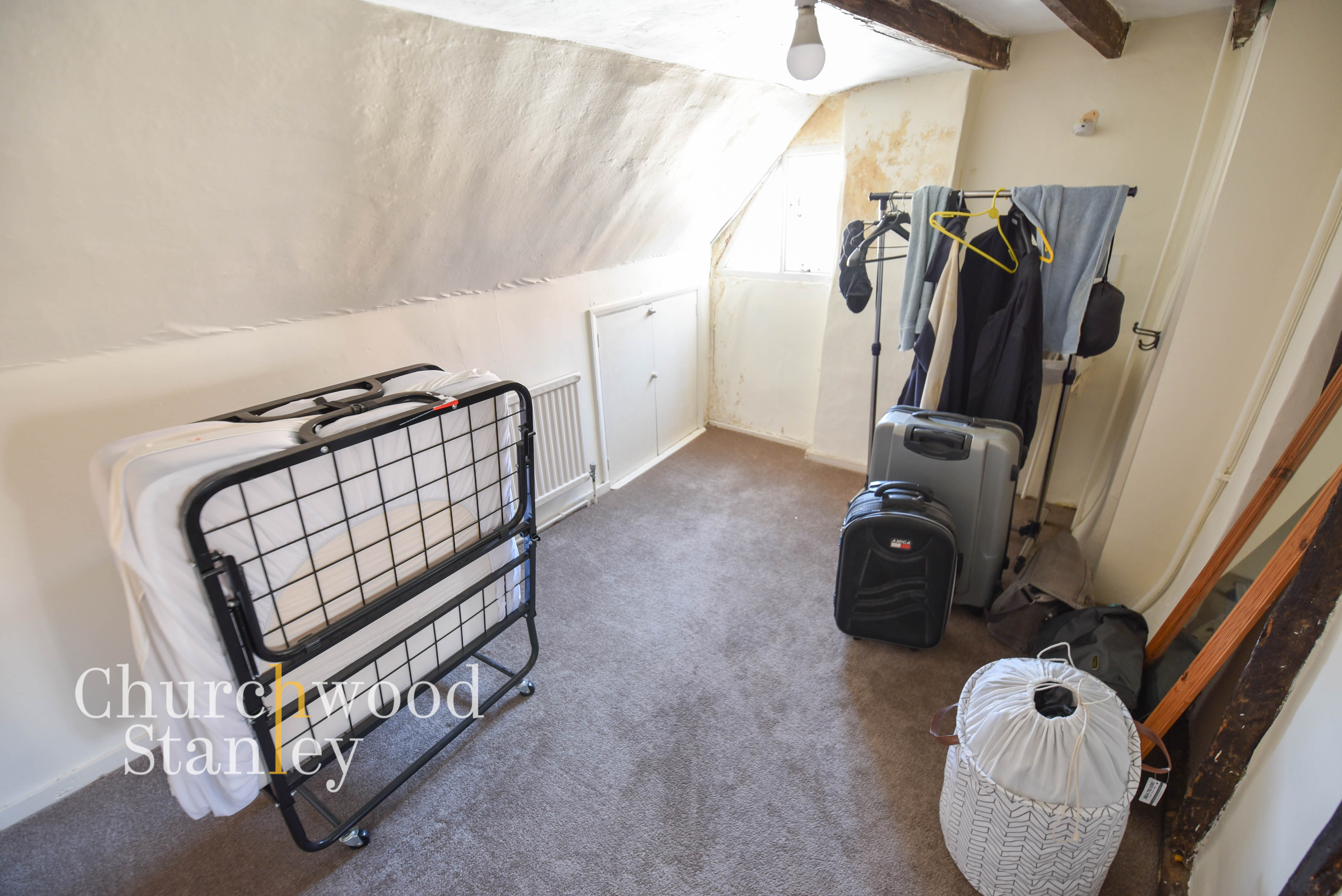 At the top of the house, the third-floor bedroom offers a distinctive and characterful space. Sloping ceilings and exposed timbers emphasise its period charm, while a dormer-style window frames views across the rooftops and brings in natural light. The room is well-sized to accommodate a double bed with additional furnishings, making it versatile enough to serve as a main bedroom, comfortable guest room, or even a quiet workspace