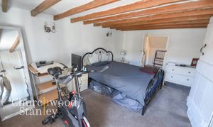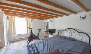 The second-floor bedroom is a distinctive space full of character, with its exposed ceiling beams and cottage-style proportions creating a wonderfully traditional feel. A broad window to the front ensures the room enjoys plenty of daylight, while the neutral décor leaves scope for a new owner to personalise. There’s ample space here for a double bed and additional furnishings and another staircase in the corner turns and rises again to the third floor.