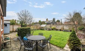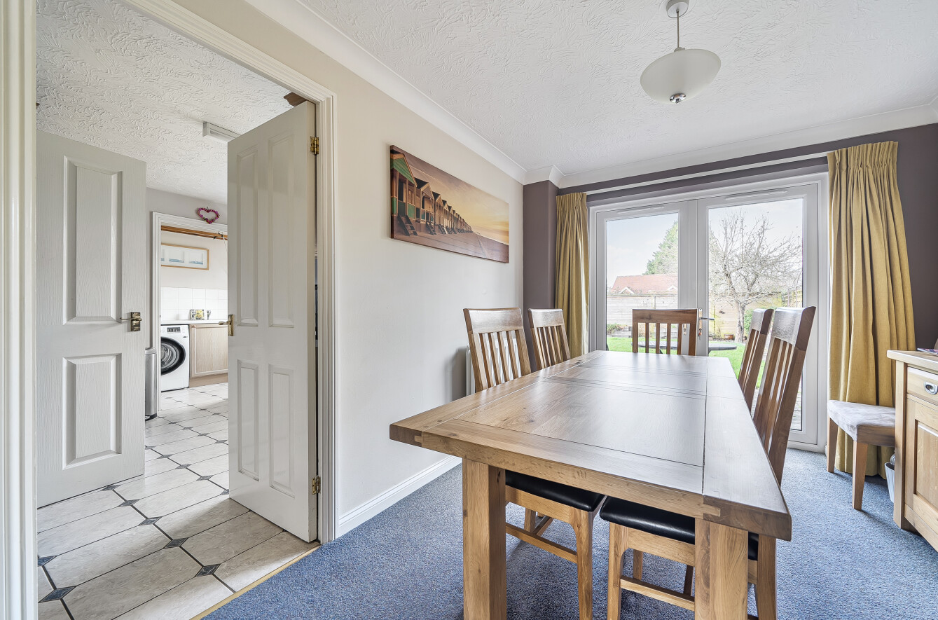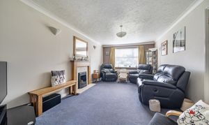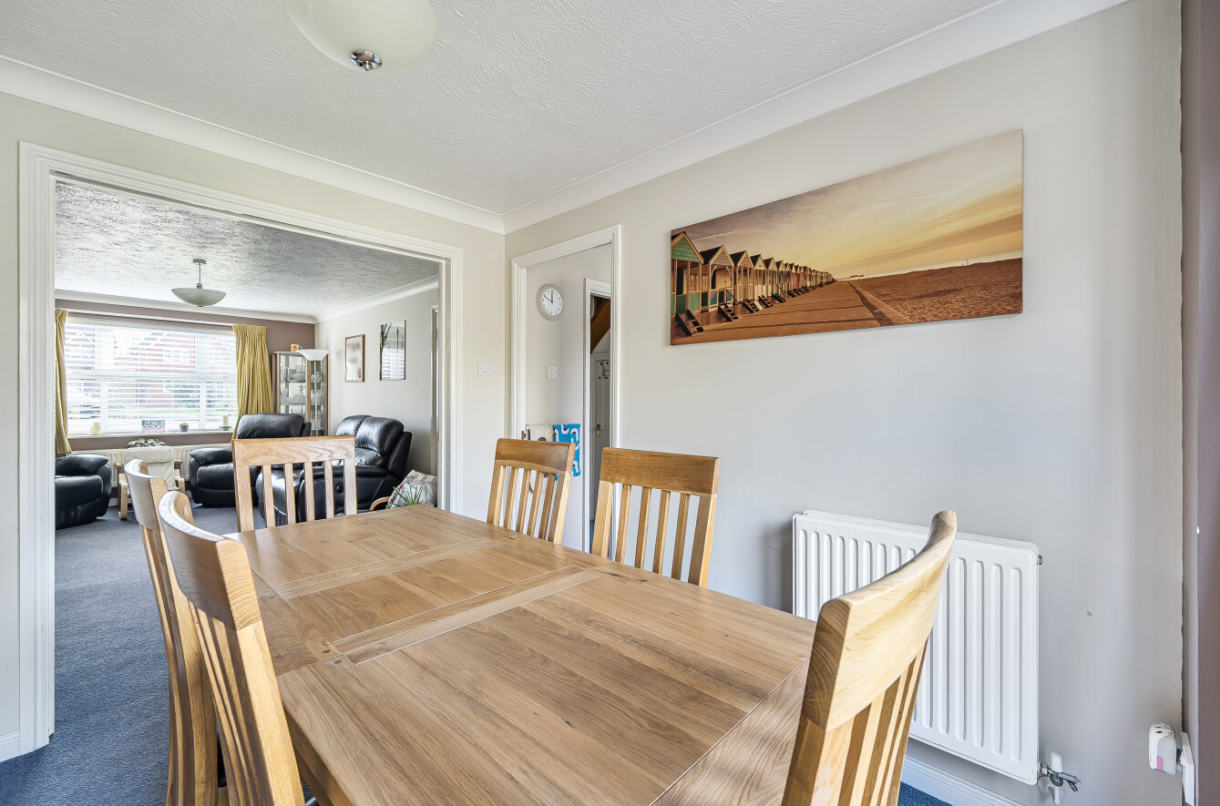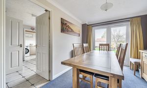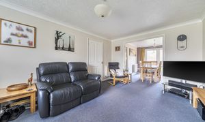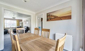 The bright and spacious sitting room with a feature fireplace with gas fire and wooden mantel. A flat archway leads into the light and airy dining room with double doors leading into the garden.