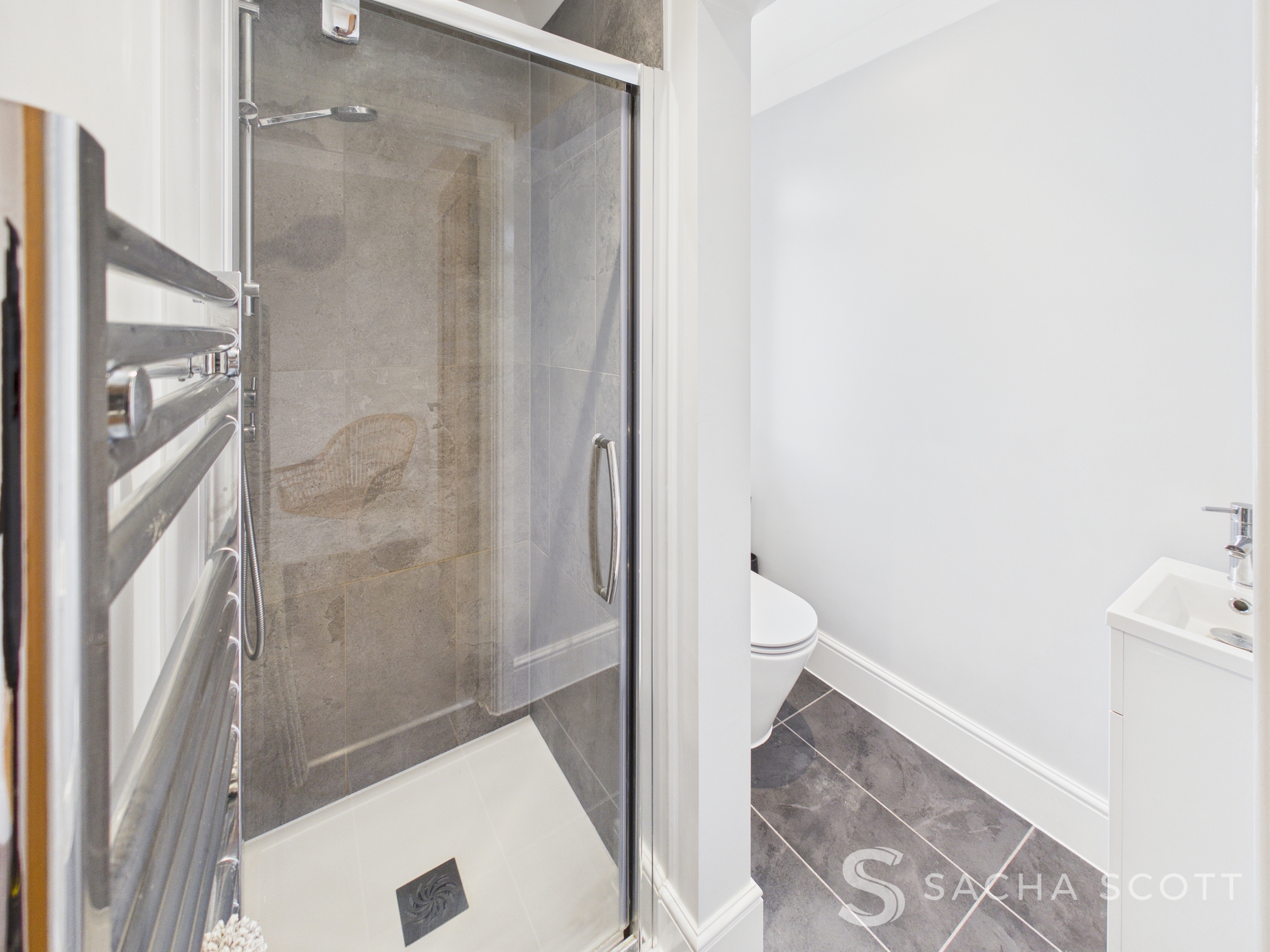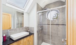 Beautifully presented, the en-suite for bedroom 3 offers a large shower enclosure, vanity sink unit, a heated towel rail and WC.