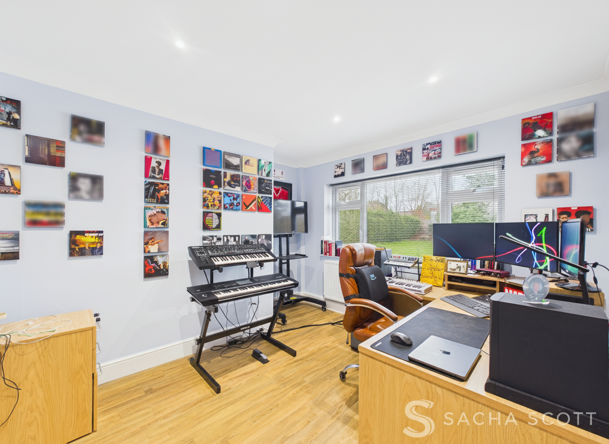 Currenlty used as a home office, this additional handy room offers views over the front of this gorgeous family home and benefits from neutral decor and high quality oak effect vinyl flooring. A flexible room that could be used a study, playroom or gym, it is located opposite the main family living area on the ground floor.