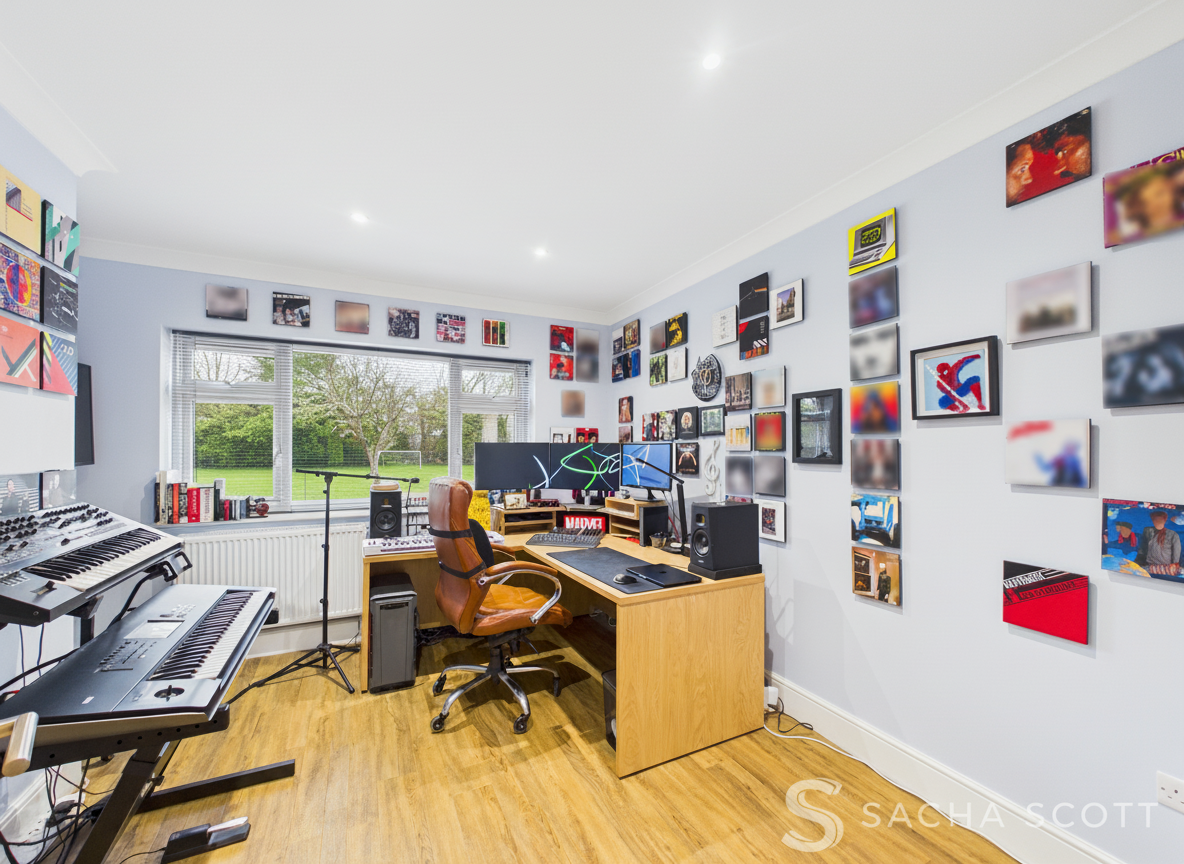 Located off of the main entrance hall, this second lounge area is neutrally presented and offers high quality oak effect vinyl flooring and views over the front and side of this fabulous family home. A unique space, this lovely lounge offers access to a large double bedroom and en-suite shower room on the first floor.