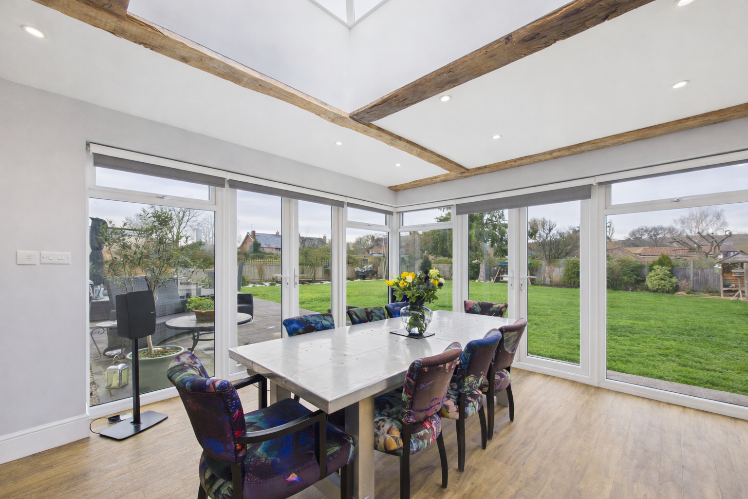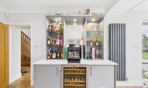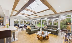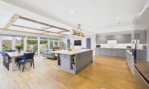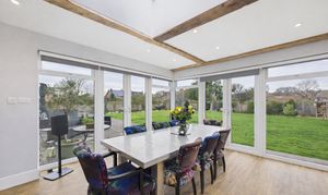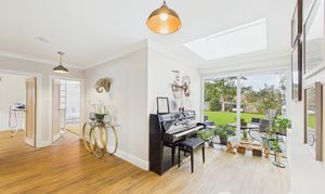 Modern and bright, the entrance hall of this stunning family home offers neutral decor, warm high quality oak effect wooden flooring and is flooded with natural light from floor to celing windows and an overhead skylight. Setting the tone from the moment you step through the front door, this is a fabulous entrance to a uniquely sensational home.