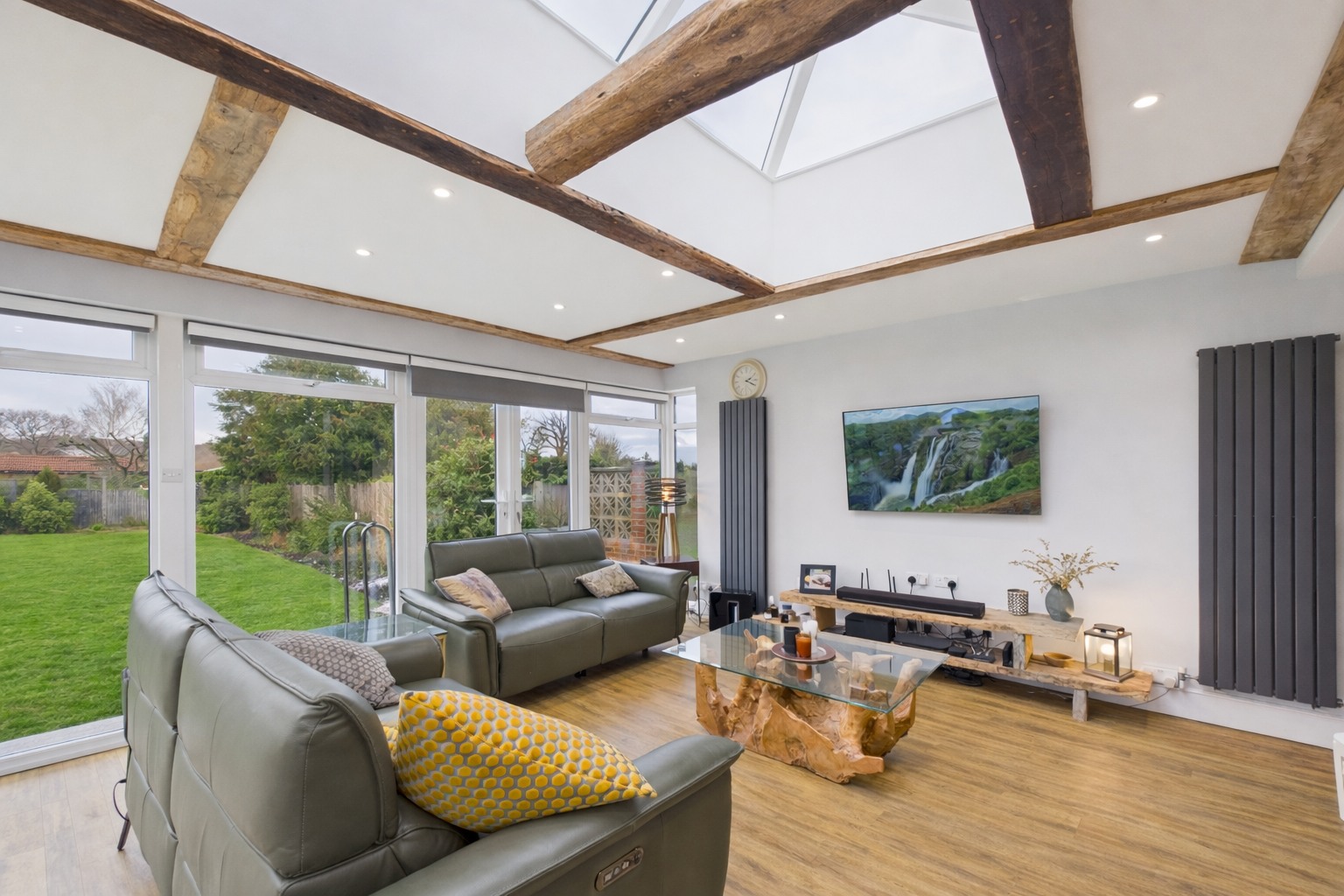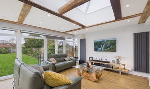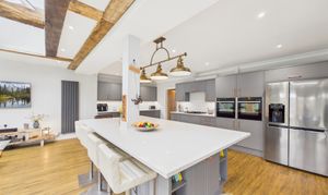 Just stunning, the hub of this magnificent family home is this jaw-dropping family room that is so spacious that you have the ability to zone it into separate living spaces. Offering ample room for a large dining table to one end and a cosy, yet spacious TV area with underfloor heating as well as radiators to the other, this gorgeous open plan space also offers a modern kitchen with central island/breakfast bar. Equipped with two full ovens, a dishwasher, a waste disposal and Qettle hot water tap, the kitchen also benefits from ample work surface and storage space and a bar area with an integrated fridge. Overlooking the garden via a wall of glass, this enviable space also benefits from a generous skylight over the living areas.