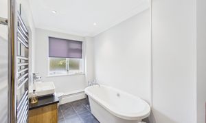 Like the rest of this fabulous primary suite, the en-suite bathroom is generous in size and offers a modern roll top bath, vanity sink, WC, ladder towel rail and walk-in shower.
