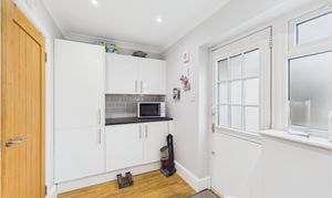 Located off of the kitchen, the utility room offers plenty of storage space, a sink and room for a washing machine and separate tumble dryer.