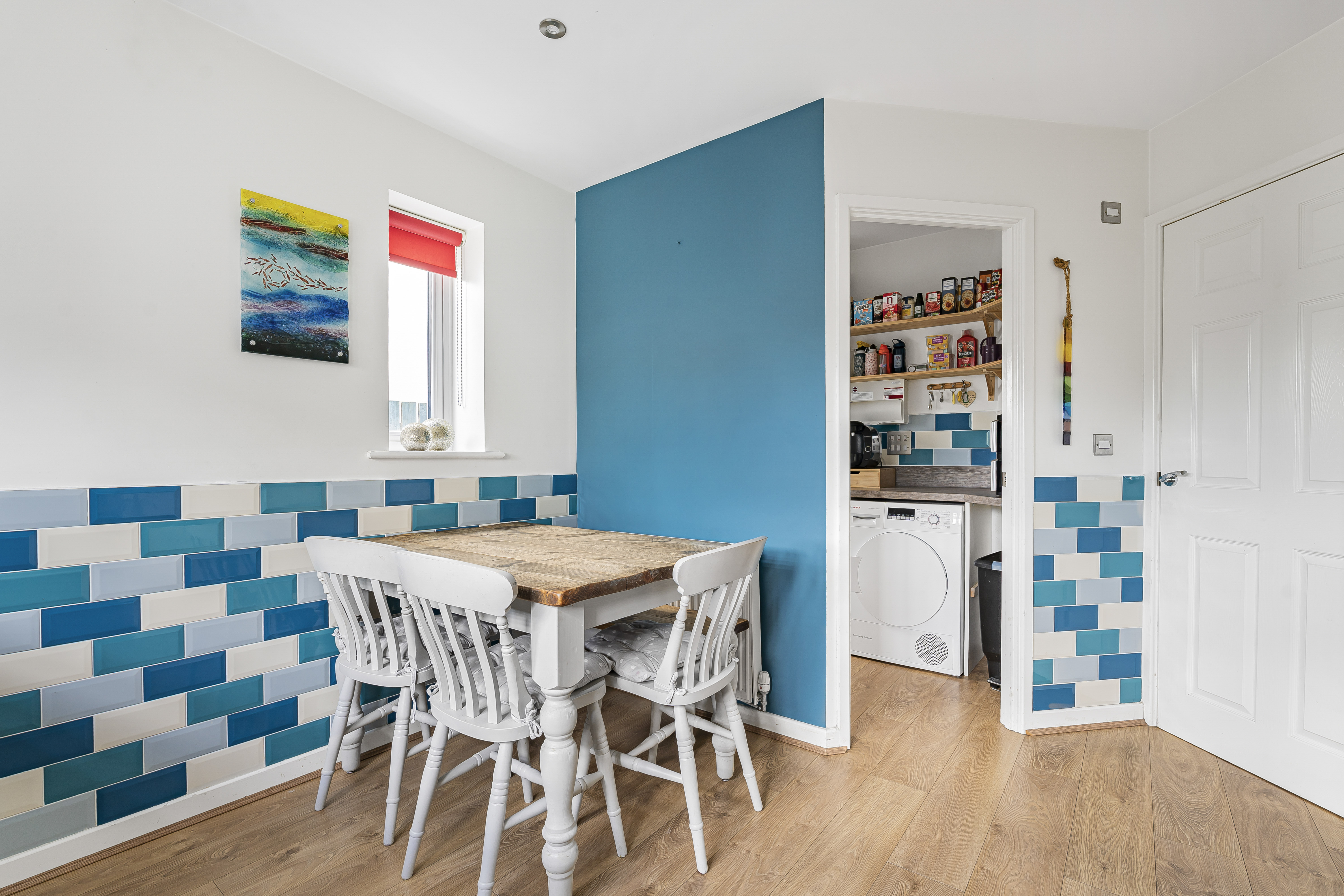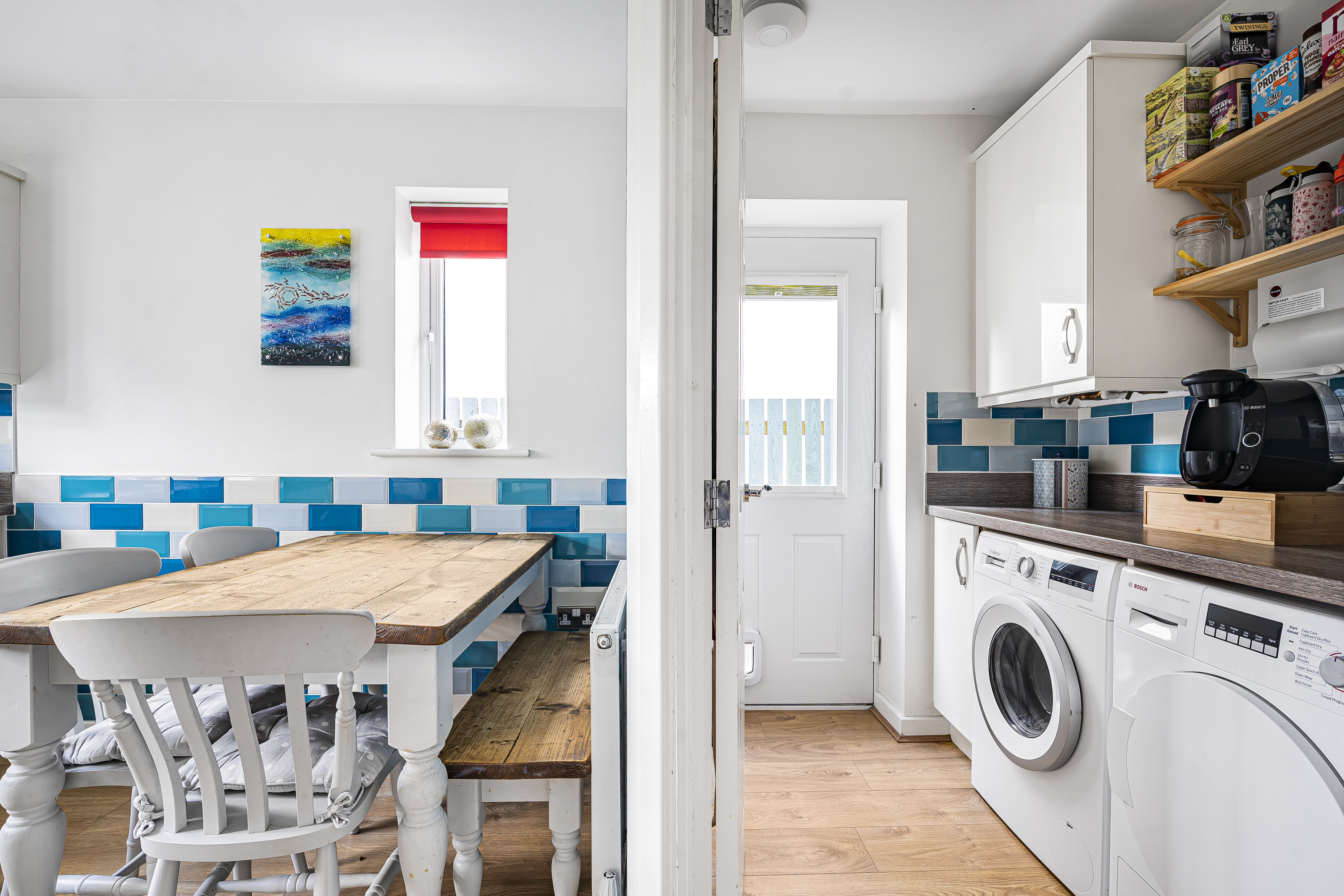 There is a door off to a utility room with plumbing for washing machine, space for tumble dryer, further cupboards with worktop over.