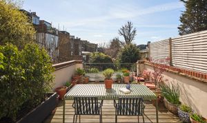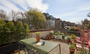 We first viewed this flat on a hot summer's day and were greeted by the large, cool living room with high ceilings, then walked through the kitchen onto the south-west facing terrace with a quiet, green outlook and knew we would be happy here. Looking out onto trees from the bedroom and being able to have morning coffees, evening meals and drinks on the sunny terrace, have made this flat a joy to live in.