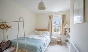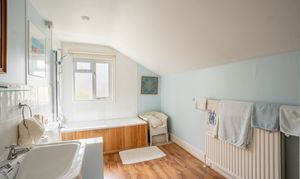 Upstairs, the property features two well-proportioned bedrooms along with a particularly spacious first-floor bathroom fitted with a modern white suite and shower over the bath.