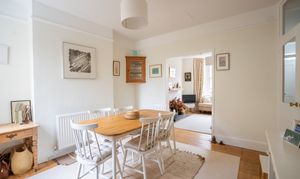 The property offers well-presented and characterful accommodation throughout, including a delightful living room with bay window and feature fireplace which opens through to a separate dining room, creating a welcoming and sociable living space. The fitted kitchen provides a range of eye and base level units with wooden worktops and direct access to the rear courtyard.