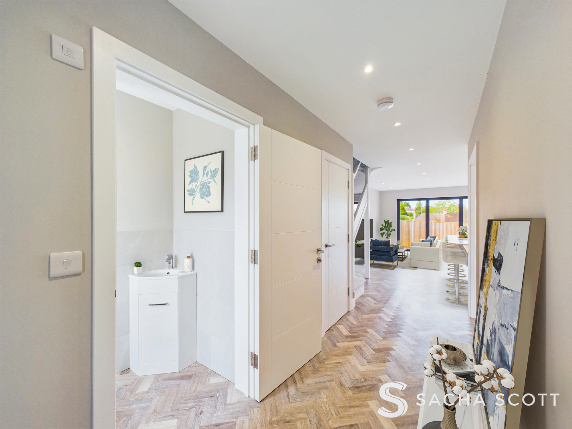 A must have in modern family homes, the downstairs WC is located off of the main entrance hall and offers a corner vanity sink unit, WC and radiator.