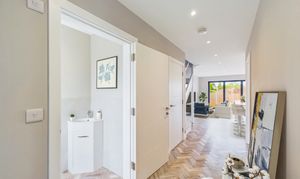 Offering luxury herringbone vinyl flooring and neutral decor, the spacious hall entrance opens up onto the kitchen/family room. Offering a large utility cupboard with adequate plumbing for a washing machine, the entrance hall is generous and bright.