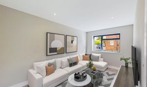 Overlooking the front of this beautiful new home, the lounge benefits from underfloor heating, luxury parquet vinyl and modern grey decor.