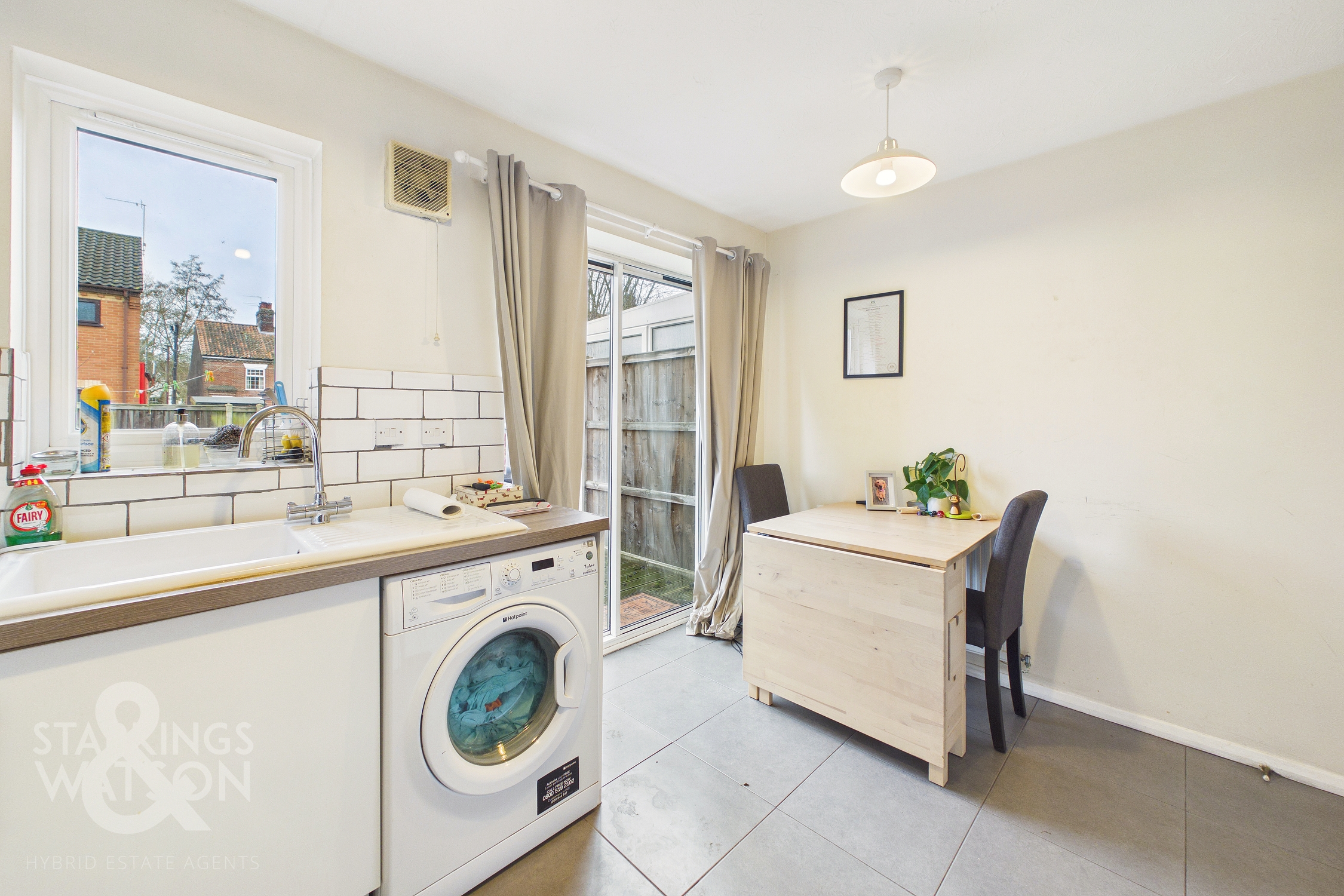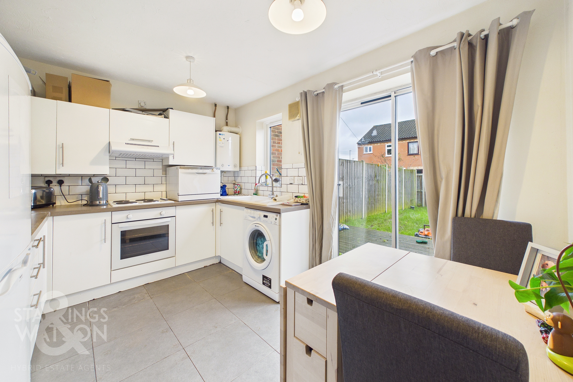 Stepping inside, you are welcomed into the spacious sitting room, enjoying a front facing aspect through uPVC double glazed windows. Hard flooring runs underfoot for ease of maintenance, while the room allows for a range of soft furnishing layouts and space underneath the stairs currently utilised for a desk, whilst a door at the end of the room proceeds into the open kitchen and dining area. The kitchen itself includes a range of wall and base units and integrated cooking appliances, including an oven, hob, and extractor. Worktop’s wrap around the space providing ample food preparation area, finished with tiled splashbacks. Under counter space is available for a washing machine and further room for an ‘American’ style fridge/ freezer. Tiled flooring runs underfoot with space for a dining table, while sliding doors open directly onto the garden and ensure the room is flooded with natural light.