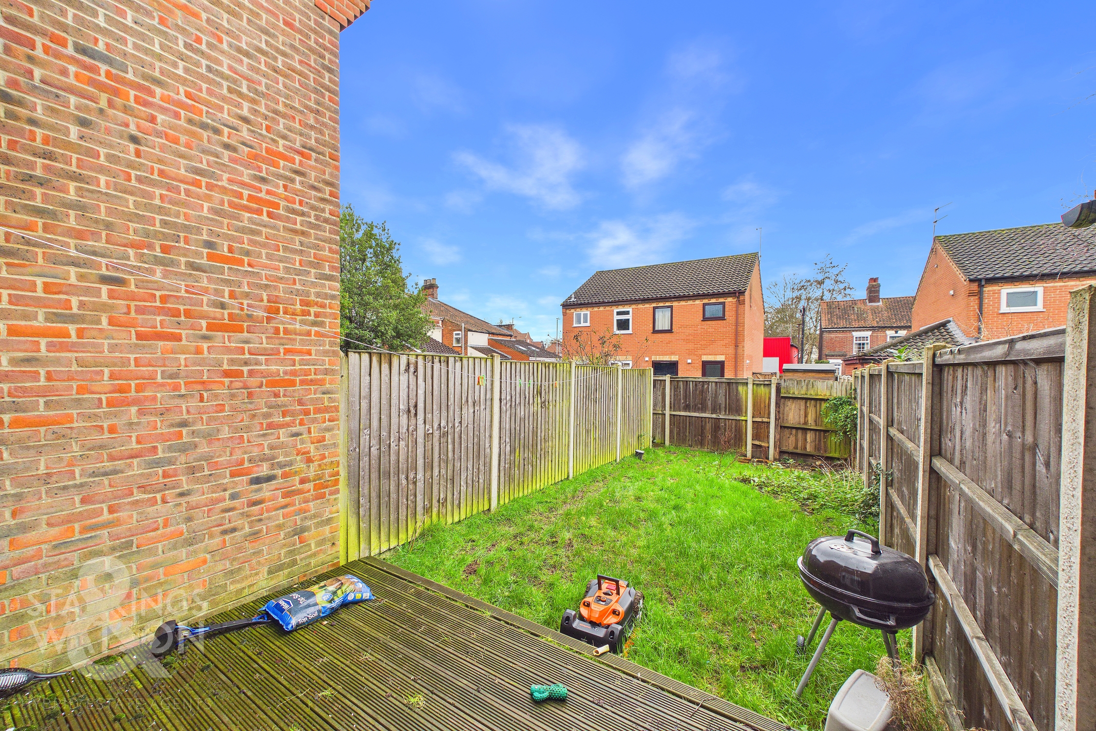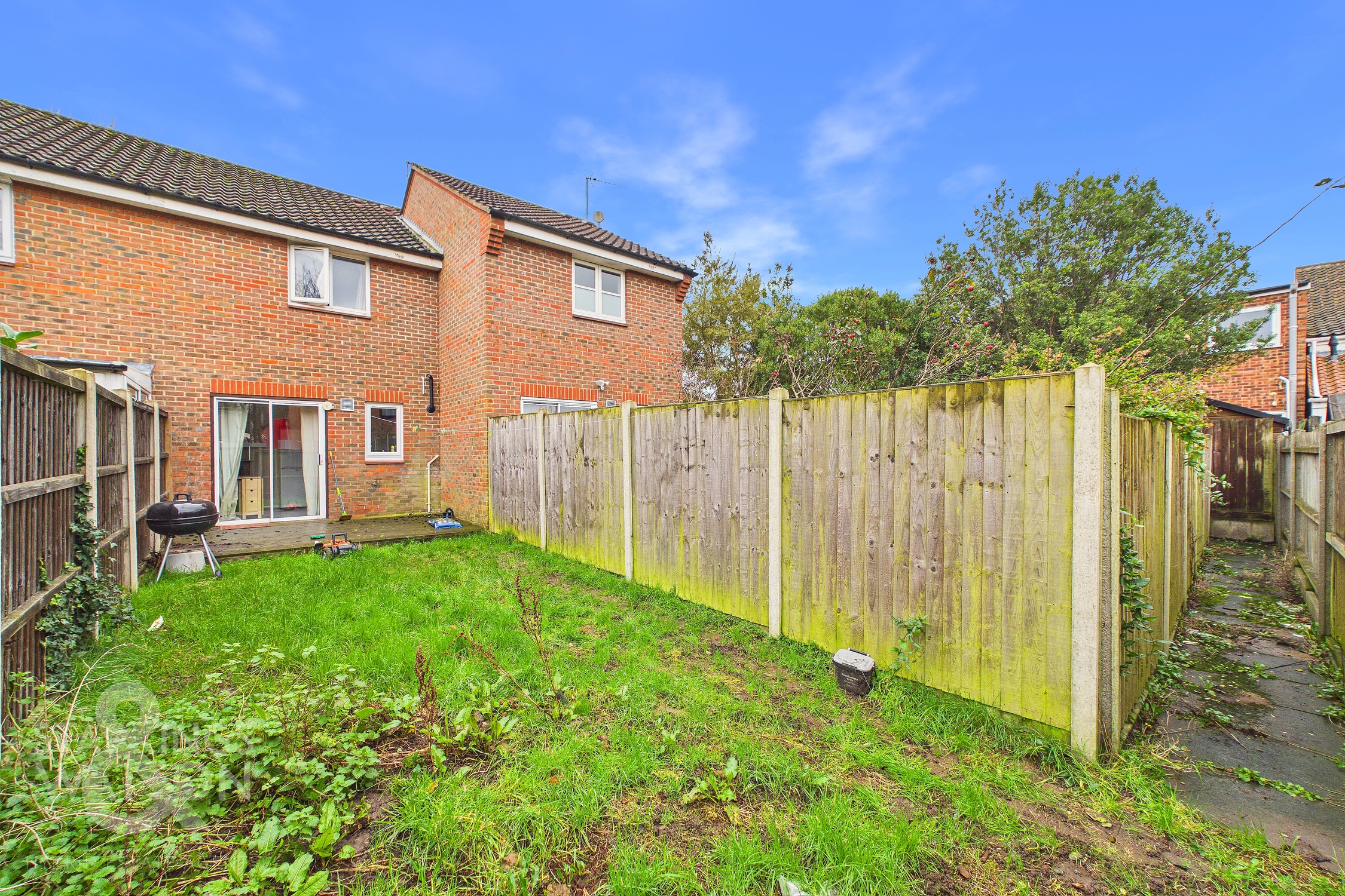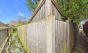 THE GREAT OUTDOORS Stepping outside, the garden is private and fully enclosed with timber panel fencing, initially opening to a raised wooden decking area ideal for outdoor furniture to enjoy the summer months. The remainder of the garden is predominantly laid to lawn, offering a blank canvas for a new owner. Tucked away at the end of the garden, a private passageway with a flagstone path leads to a latch and brace gate, opening directly onto the adjacent driveway providing off road parking.