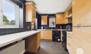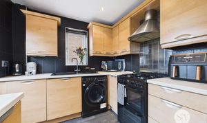 As you walk through the entrance, you are greeted by the inviting ambience of a spacious reception room, perfect for entertaining guests or unwinding after a long day. This kitchen offers a clean and functional space, featuring a standard range of fitted units and worktop surfaces. There's space for essential appliances, along with a stainless steel sink and mixer tap. The layout is straightforward and easy to maintain, making it a practical area for everyday cooking and meal preparation.