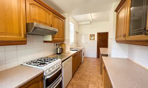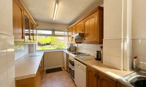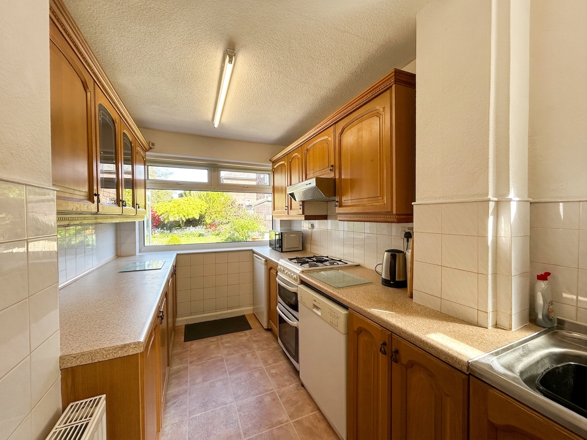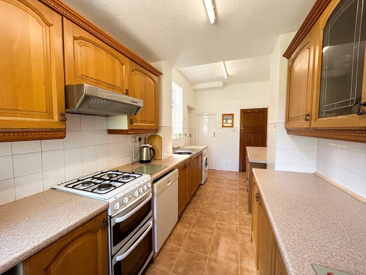 Window to rear elevation. Fitted kitchen with a range of wall and base units with space for oven, washing machine, under the counter fridge and freezer. Internal door through to under the stairs storage area. External door through to garage.