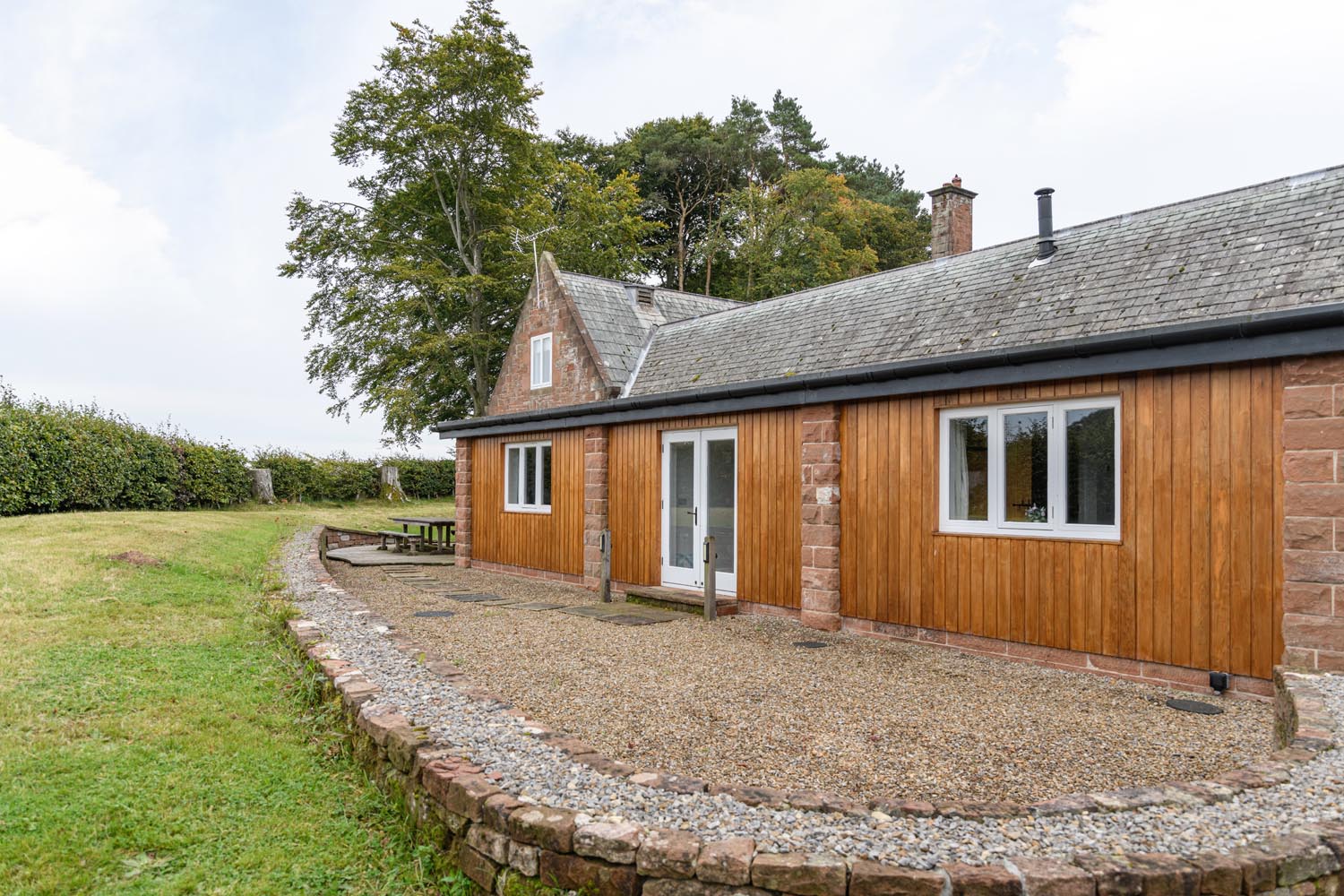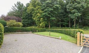 French doors leading from the west wing open onto a gravelled terrace—an easy-to-maintain outdoor area with room to sit out and take in the surrounding landscape. To the front of the property there is an attractive courtyard garden with lawned area featuring a date stone and large storage cupboards. Beyond, dedicated private parking also features for multiple vehicles. At the opposite side of the property, there is a generously sized lawned area. Enclosed by hedging and trees, Little Gables enjoys a quiet outlook towards neighbouring woodland and open fields.