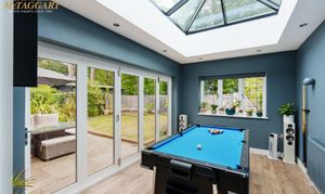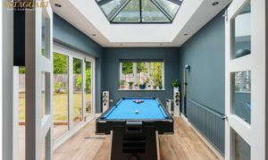 The large entrance hall has stairs rising to the first floor, under stairs storage cupboard and WC. From the hallway there is a separate dual aspect living room with a brick built feature fireplace, with separate twin doors leading into the kitchen diner. The open planned kitchen diner is modern in style fitted in 2023 with Resin worksurfaces, a selection of eye level and base units, an island work station with storage and integrated wine cooler, various integrated appliances include Siemens four ring induction hob, twin Siemens oven and grills, dishwasher and door onto the rear garden. A separate utility room with space for washing machine and tumble dryer has a door into the double garage with power and lighting and a wall mounted Potterton combi boiler, continuing on the ground floor there is a further room from the kitchen diner currently used a games room with bi fold doors onto the south facing rear garden, as well as a self-contained bedroom again with door onto the rear garden and its own walk in wet room with WC, wash hand basin and vanity unit.