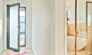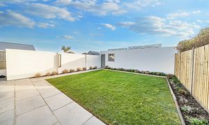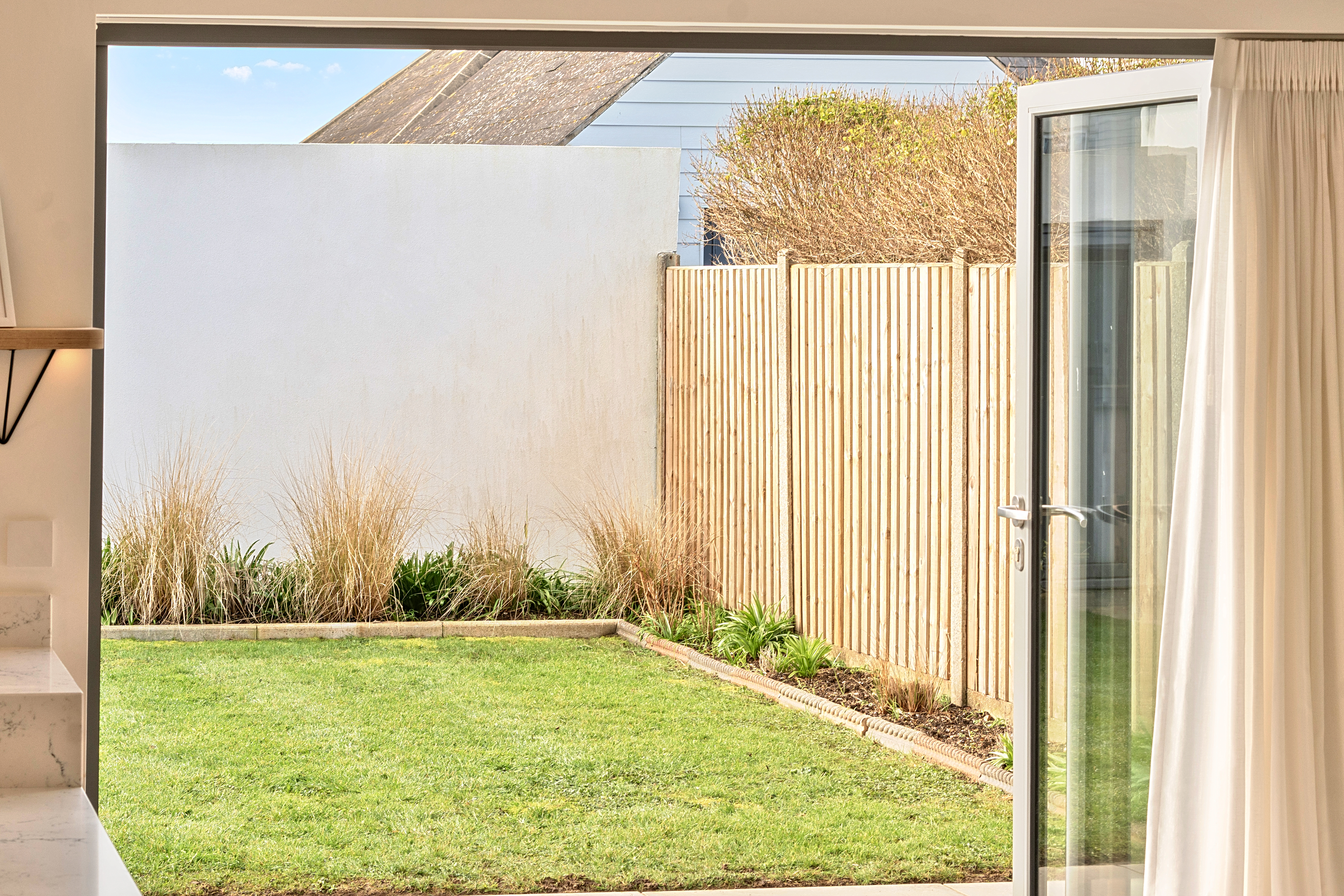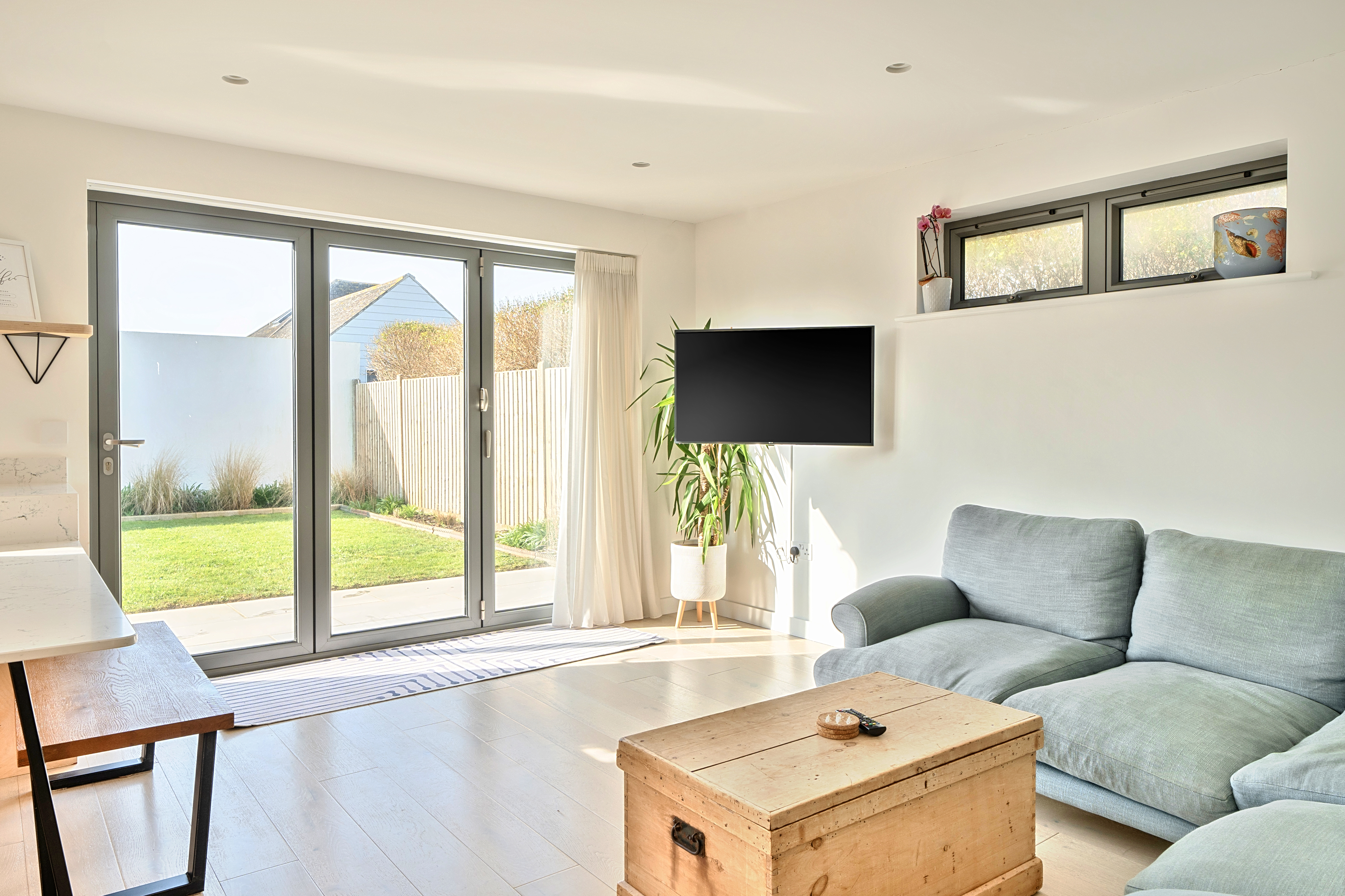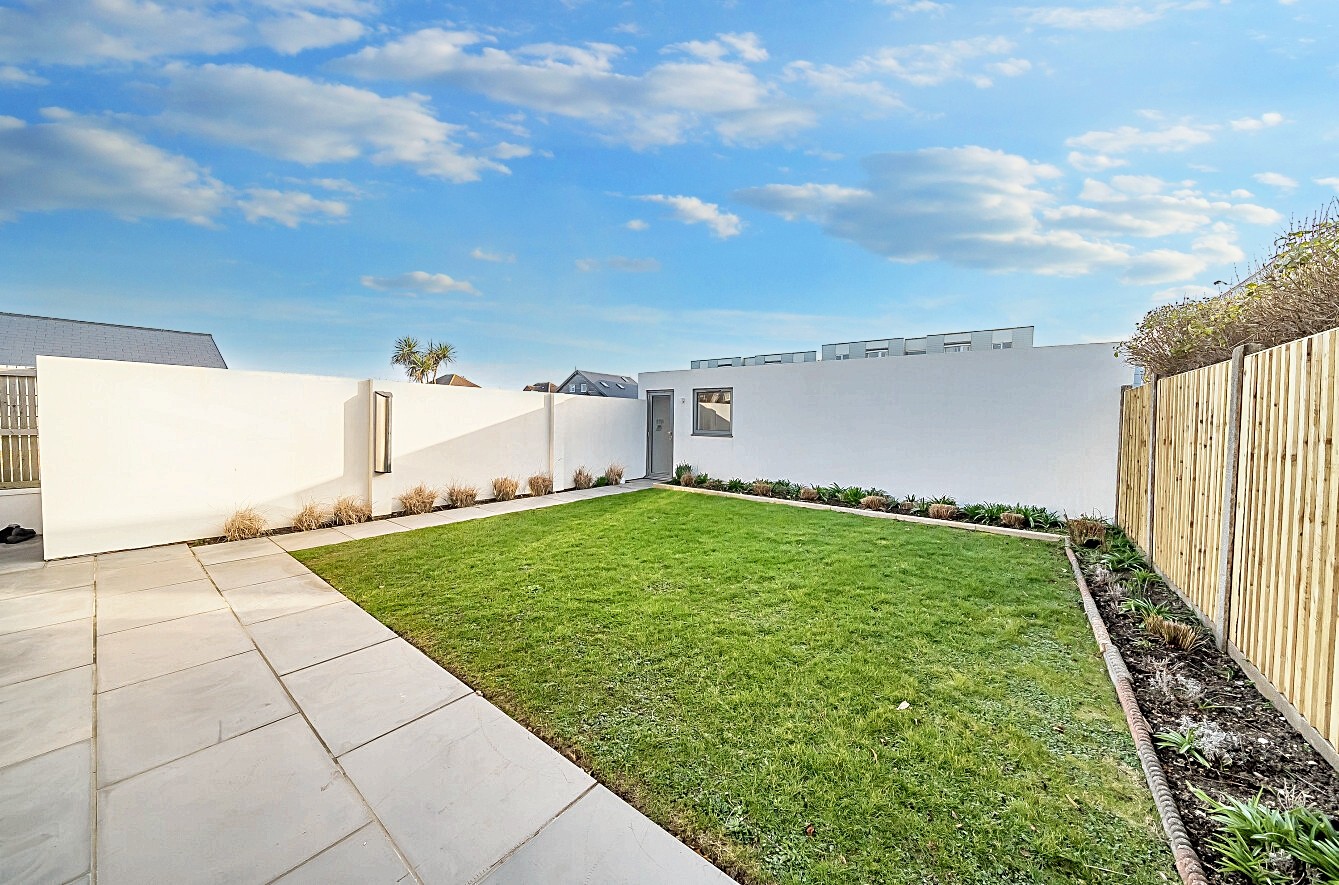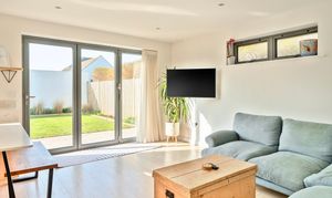Outside, the walled rear garden is private and fully enclosed, mainly laid to lawn with a patio area and border planting. There is also a convenient warm outdoor shower to the side, ideal for rinsing off after a swim, surf or dog walk. The garage has been cleverly divided to create a useful home office with power and heating, again finished with engineered oak flooring, and a separate storage area for bikes or beach gear. The driveway offers ample parking as well as a practical EV charger and is neatly finished with contemporary planters, adding to the property’s smart kerb appeal.