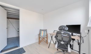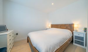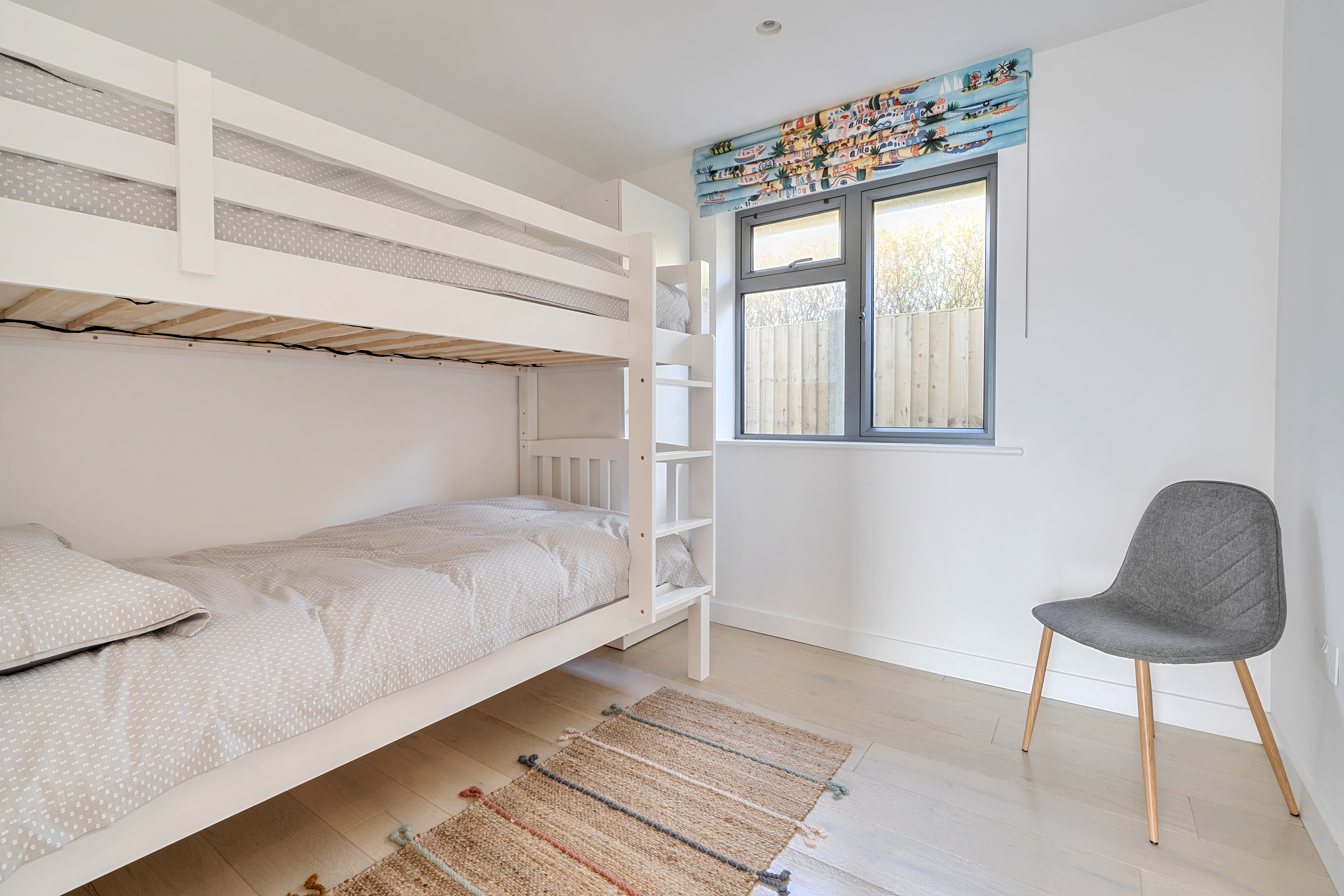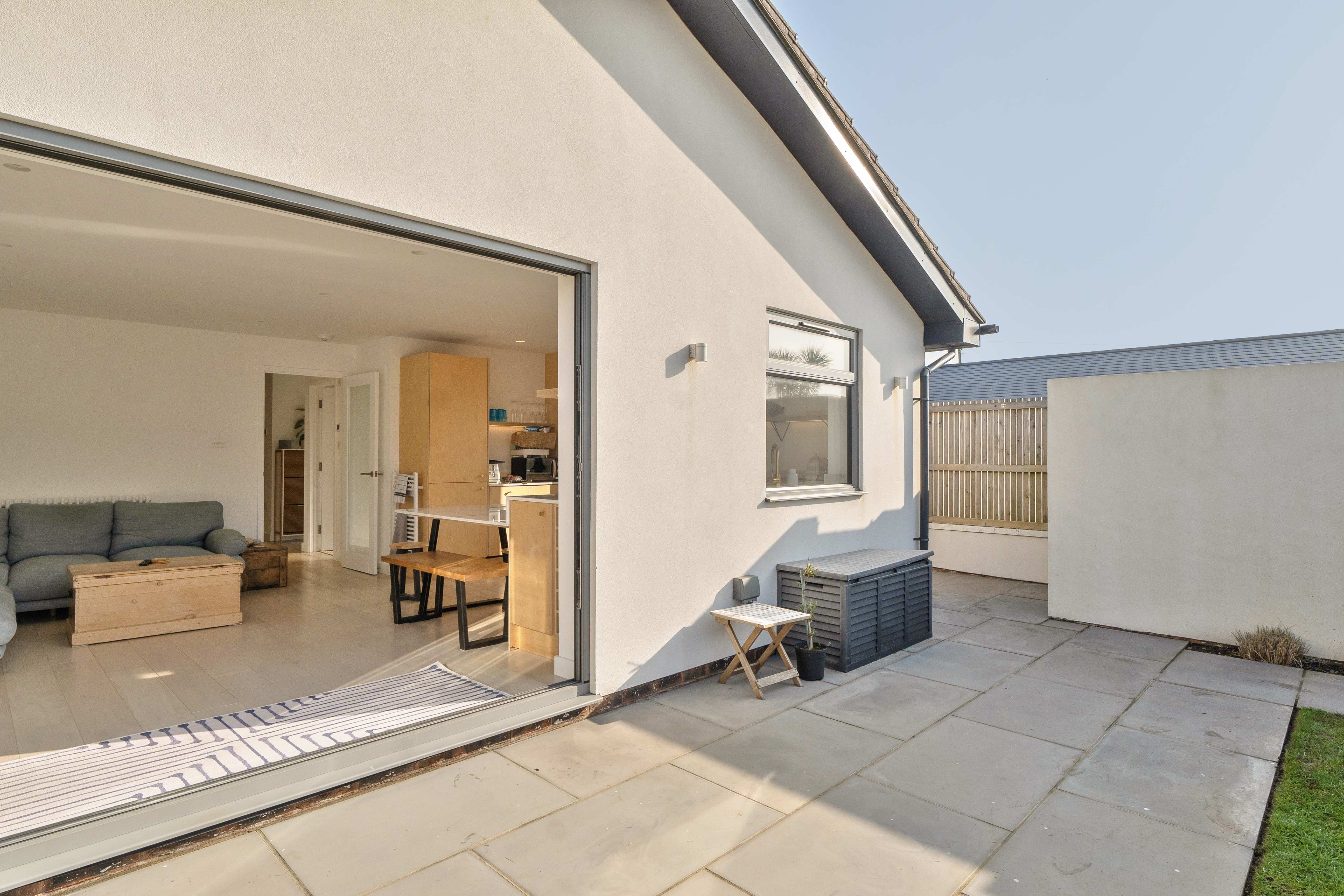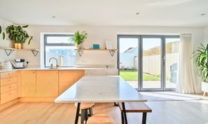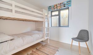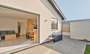 Renovated in 2022 by a well-regarded local developer, the property has been thoughtfully modernised throughout, featuring a practical layout and high-quality finishes. At the heart of the home is a bright, open-plan living space that opens directly onto the private, south-facing garden. Large aluminium bi-fold doors flood the room with natural light, and the cosy yet spacious living area is perfect for everyday family life. The kitchen is bespoke, crafted from birch ply with sleek stone worktops, integrated appliances and a built-in dining area, all set against engineered oak flooring that runs throughout the home.