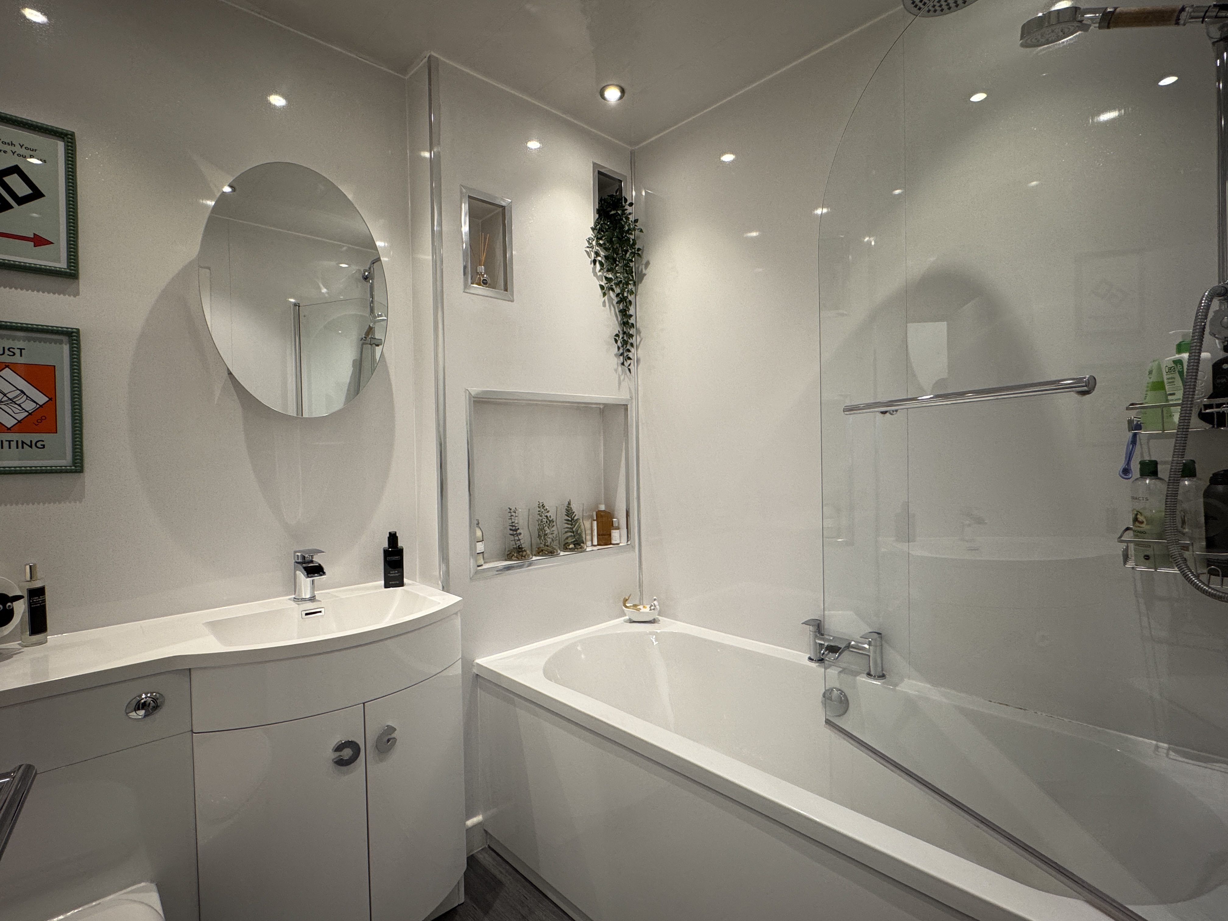 Both bedrooms are double in size, with the master bedroom currently utilised as an office and dressing room, showcasing the versatile layout of this property. In bedroom 2, a king-size bed (not included) can comfortably fit. The modern contemporary bathroom features a mains powered shower over the bath, providing convenience and comfort.